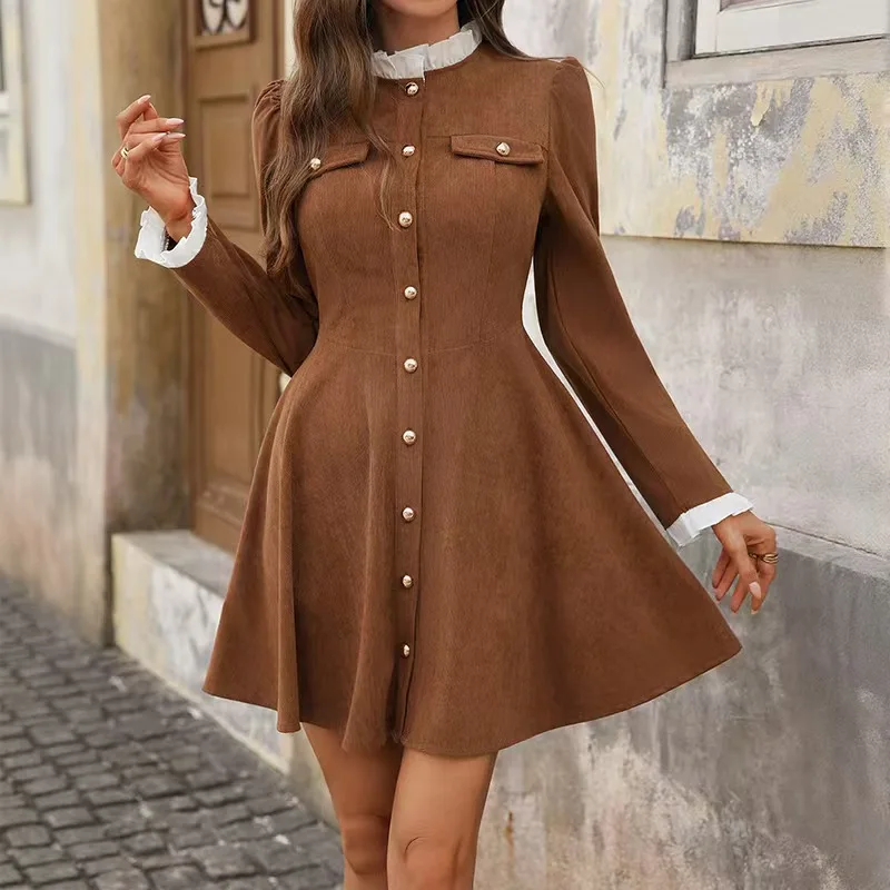 ZYHT 21541 Wholesale Crew Neck High Waist Casual Dresses Elegant Lace Velvet Mermaid Hem Ruched Long Sleeve Dresses for Women