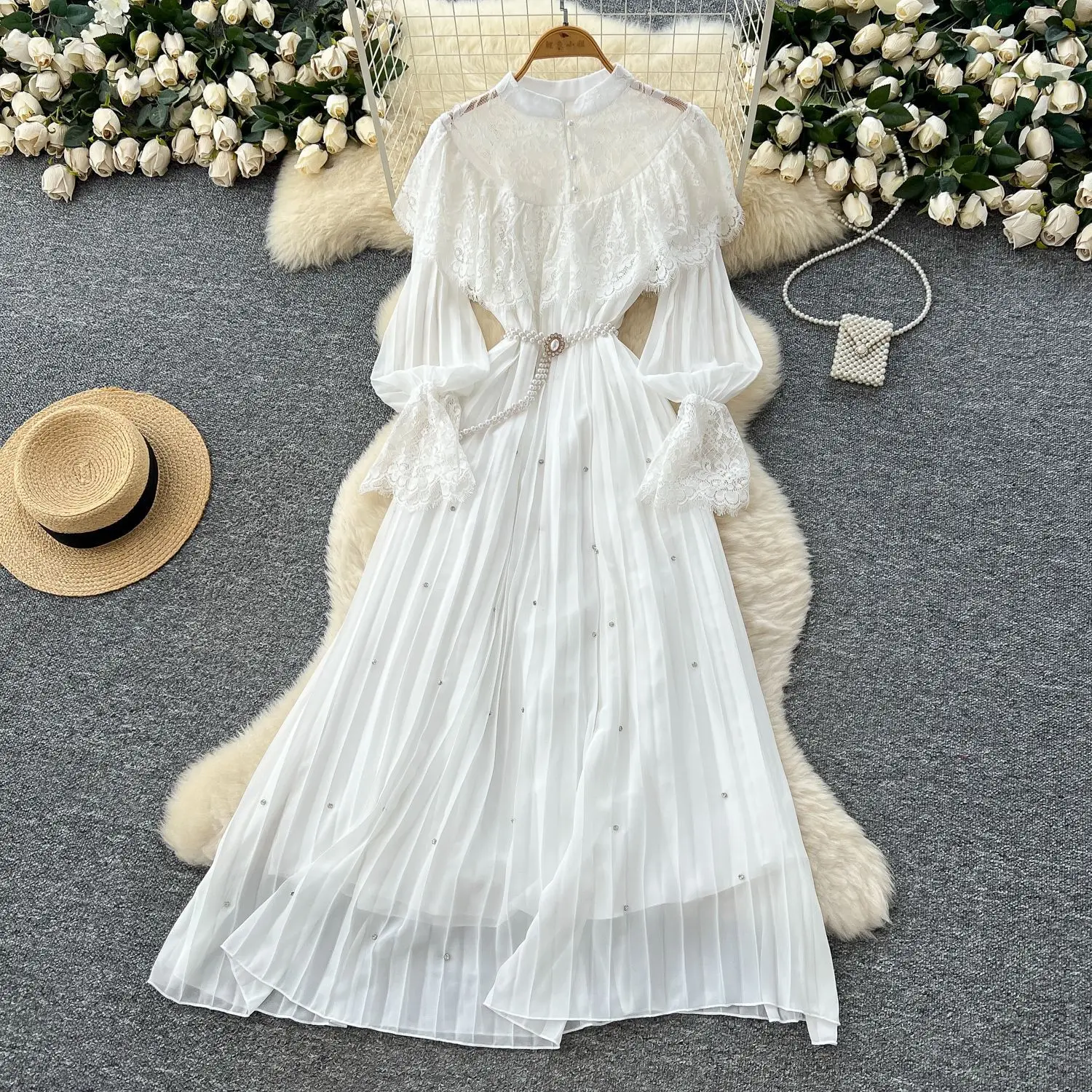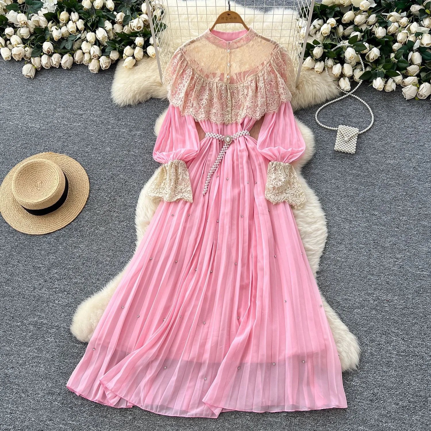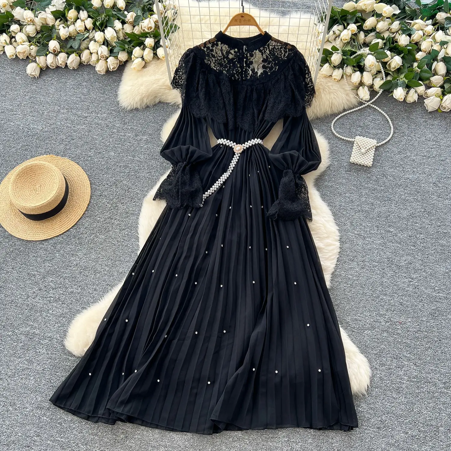 ZYHT 21541 Wholesale Crew Neck High Waist Casual Dresses Elegant Lace Velvet Mermaid Hem Ruched Long Sleeve Dresses for Women