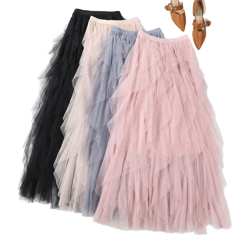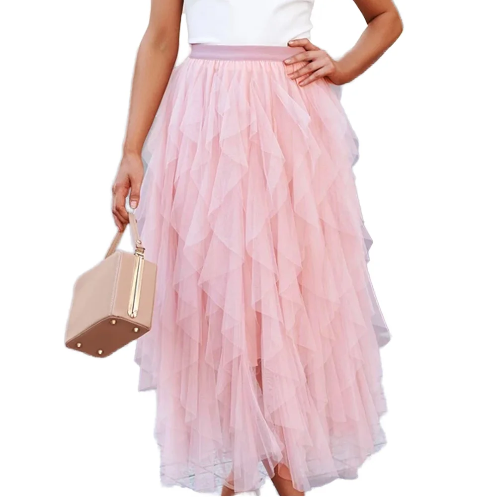 Ruffle Mesh Layered Midi Skirt Gitterroch-Rock for Women Custom Asymmetrical Hem Pleated Flared Designer Tulle Clothing