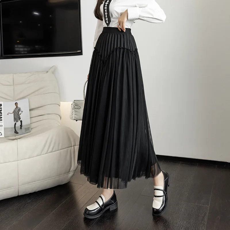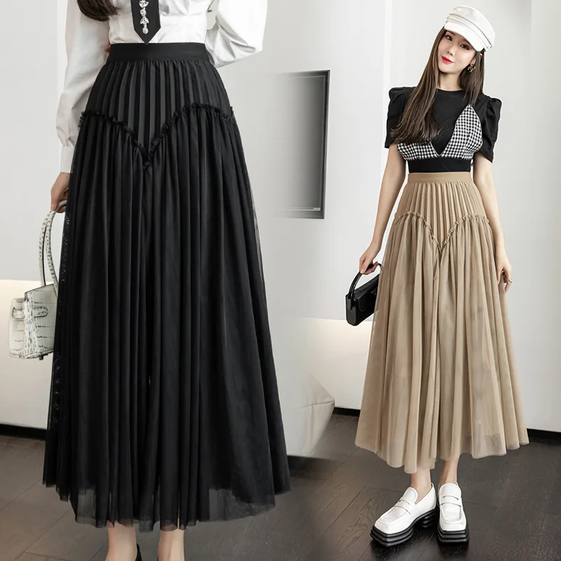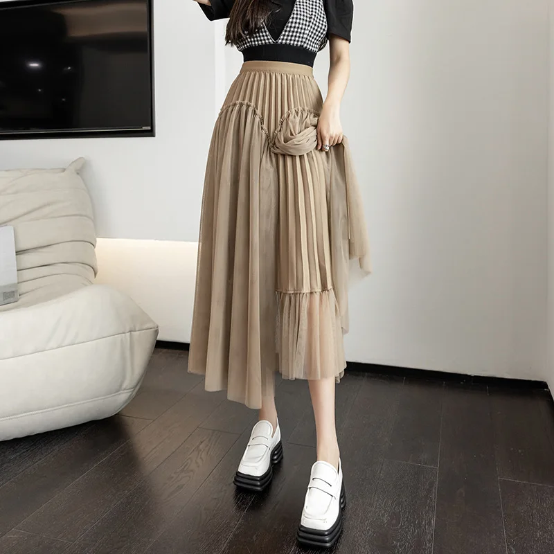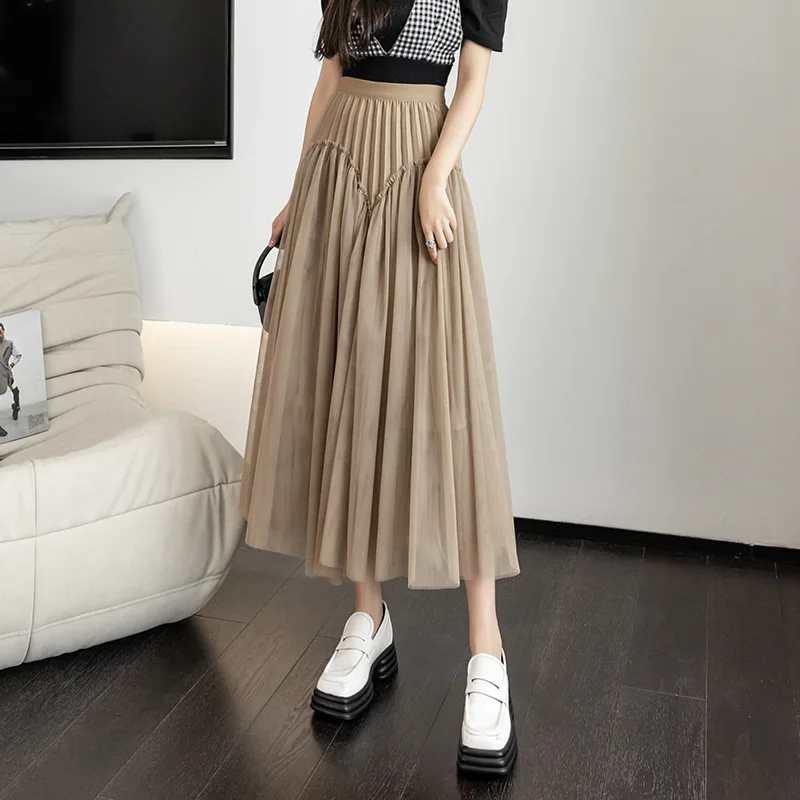 Wholesale Summer New High Waist A-Line Pleated Skirt for Women French Style Design Mid-Length Mesh Casual Slimming Fit