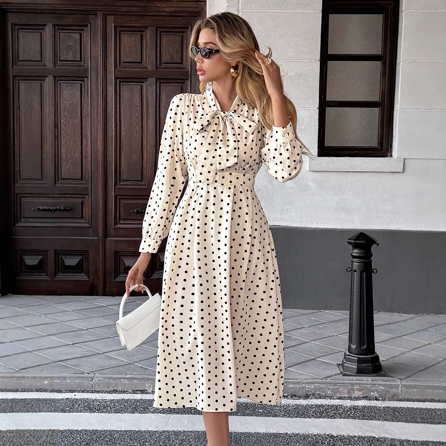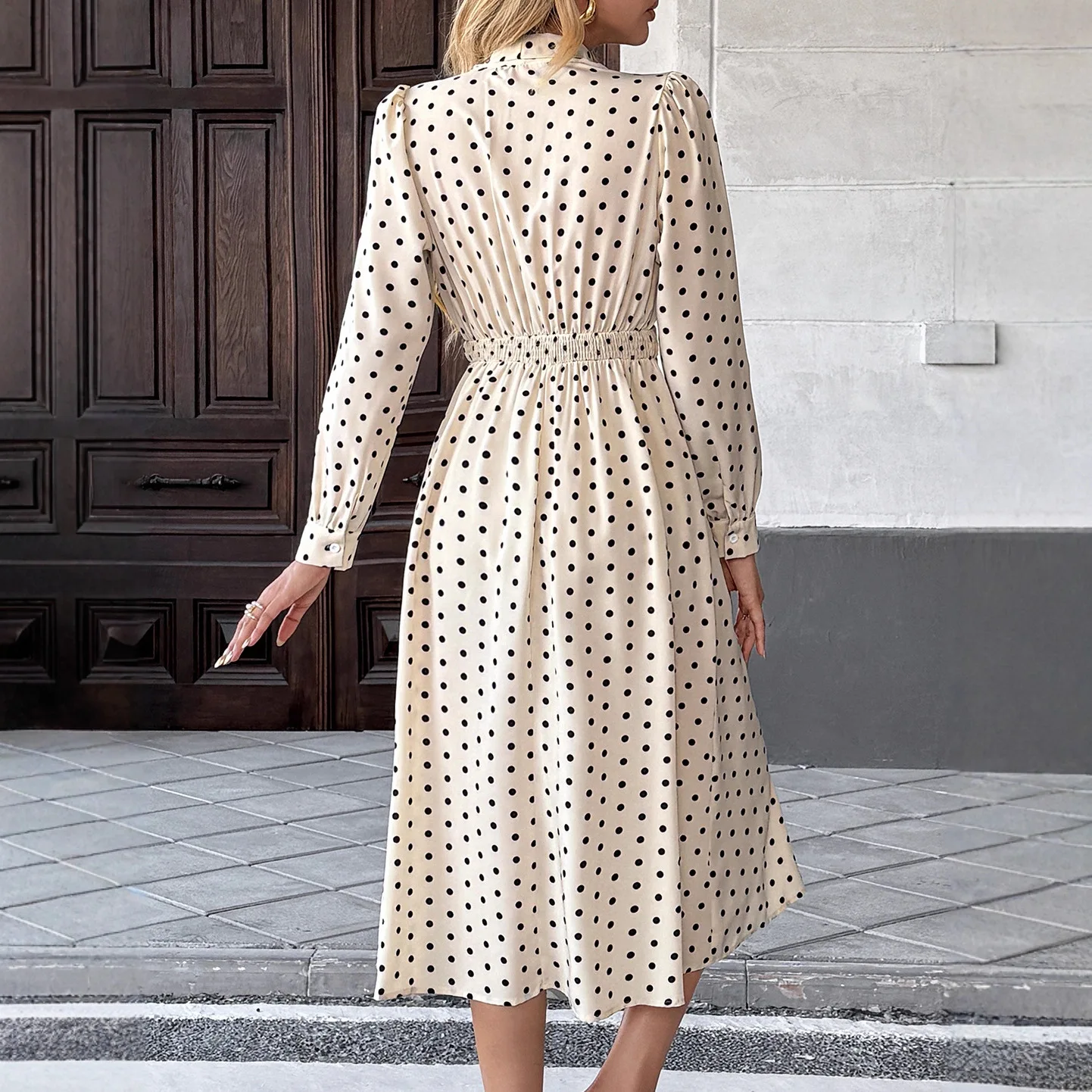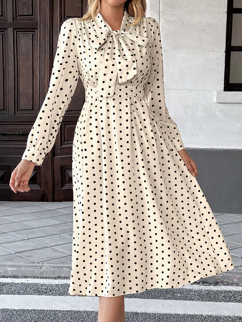 Autumn Polka Dot Print Casual A-Line Flared Midi Dress White Black Polka Dot Long Sleeve Crocheted Neck Shirred High Waist