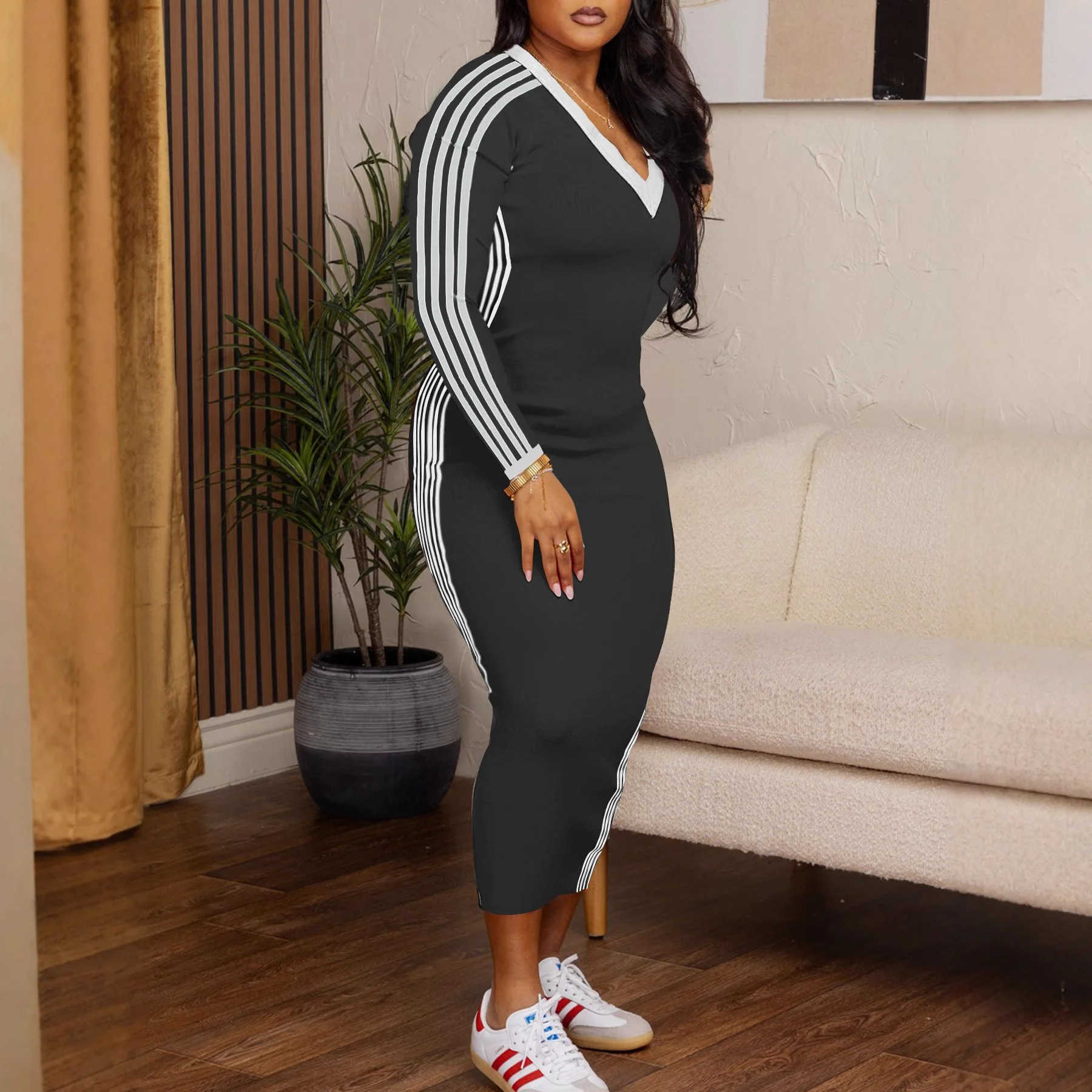 Elegant Slim Maxi Dress for Women Fashionable Striped Casual Style Digital Printing Winter Sportswear Plain Dyed Day Occasion