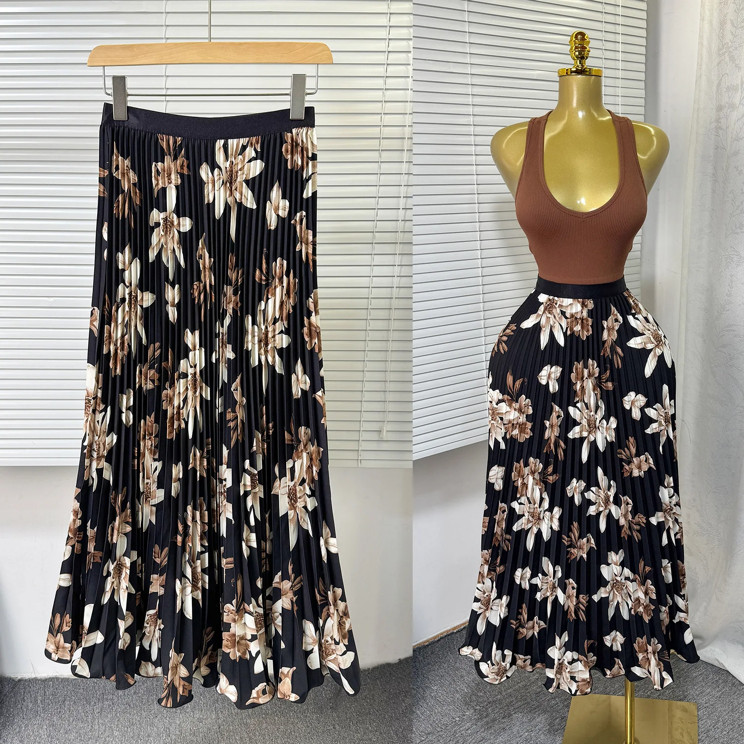 Lady's New Sweet Autumn Vintage Print Nonwoven Comfortable Versatile Mid-length A-line Pleated Skirt with High Waist Design