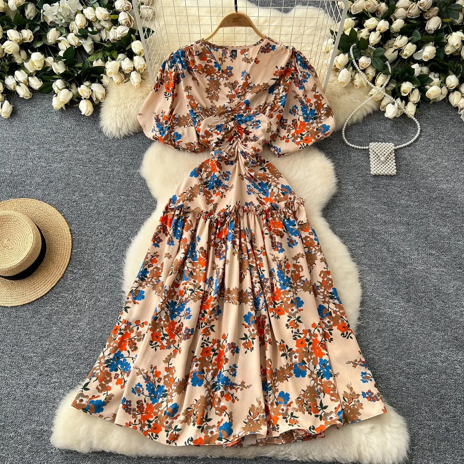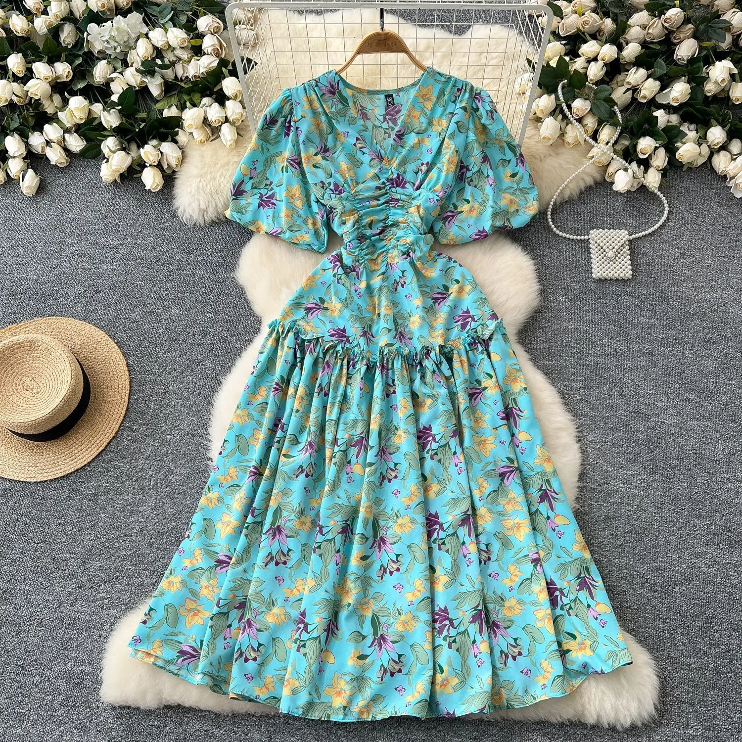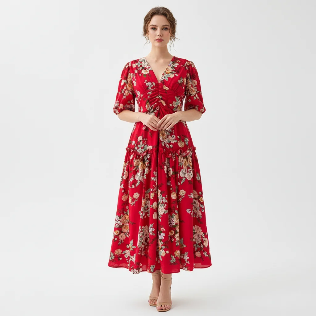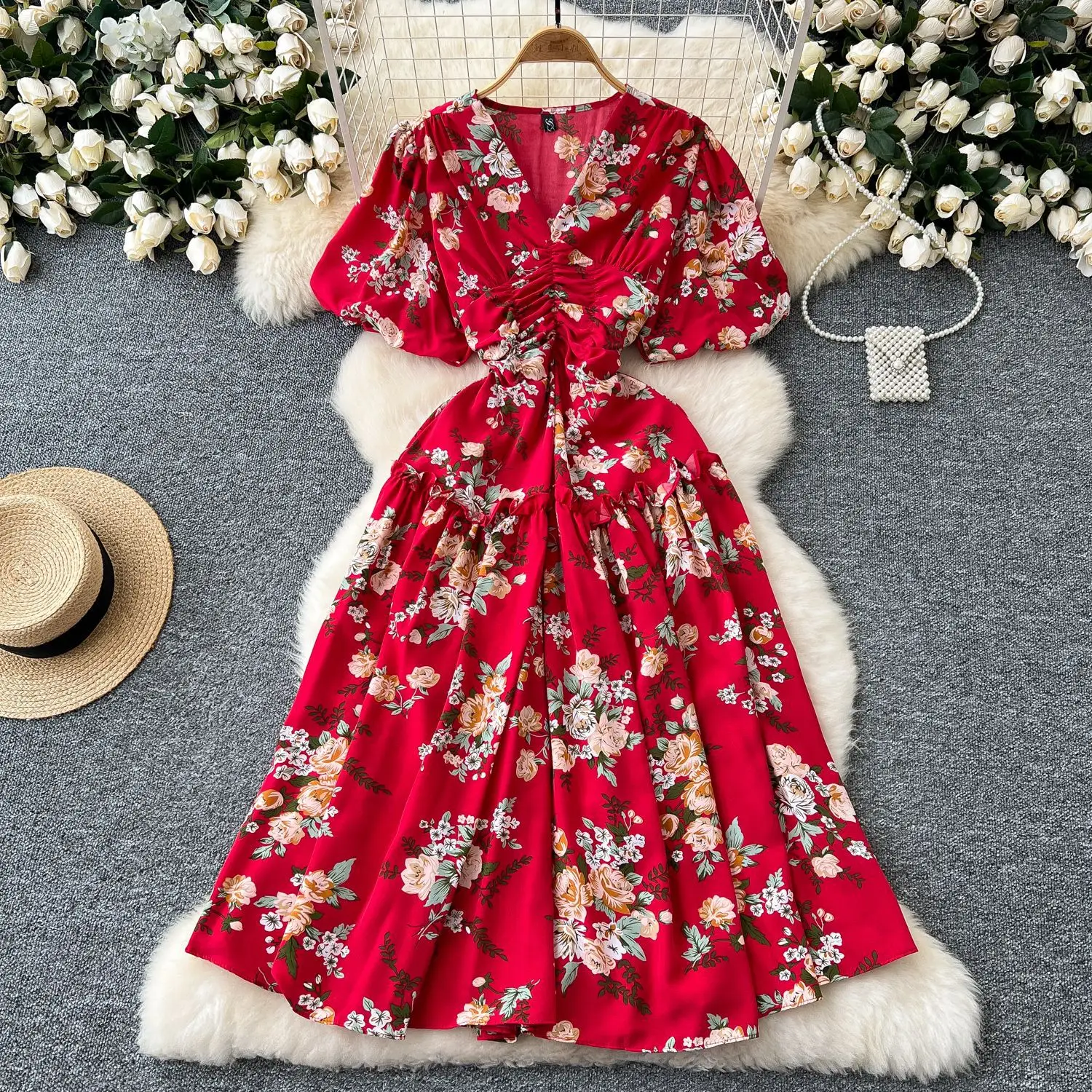 Summer Casual Woven Breathable Washable Sweet V-Neck Tunic Slim Pleated Midi Empire Waist Floral Lace Dress for Women