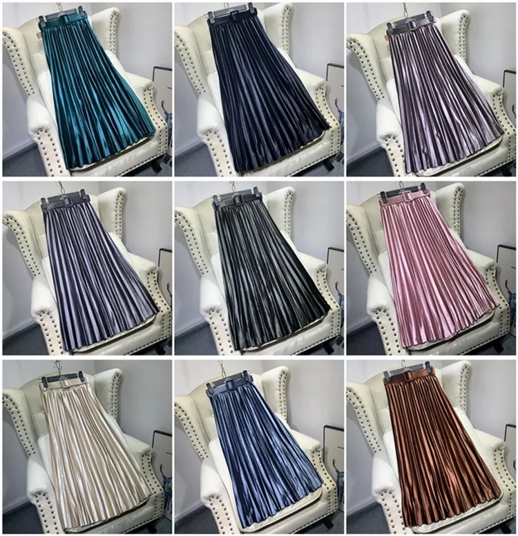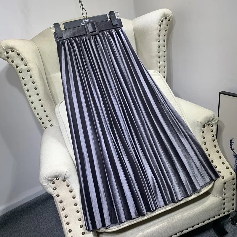 Mid-Length High Waist Slim A-Line Satin Pleated Women's Skirt with Breathable Casual Style Embroidery Ruffles Belt Decorations
