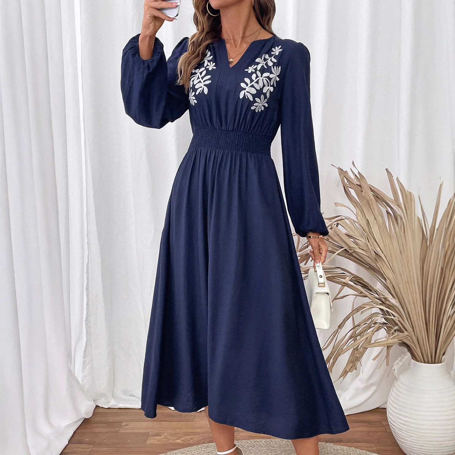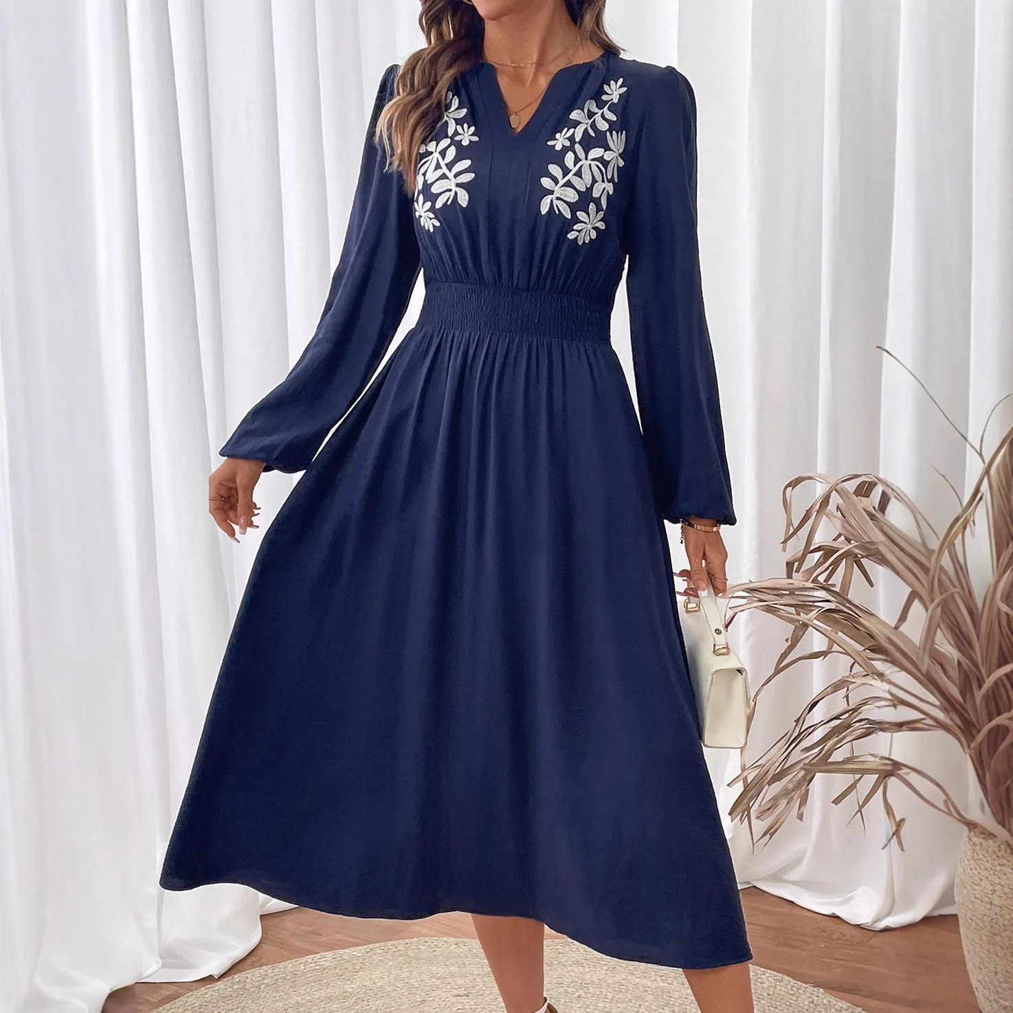 Women's Vintage Elegant Ethnic Style Blue Floral Dress Long Sleeve Knee-Length Waist-Shrinking V-Neck Polyamide Lace for Autumn