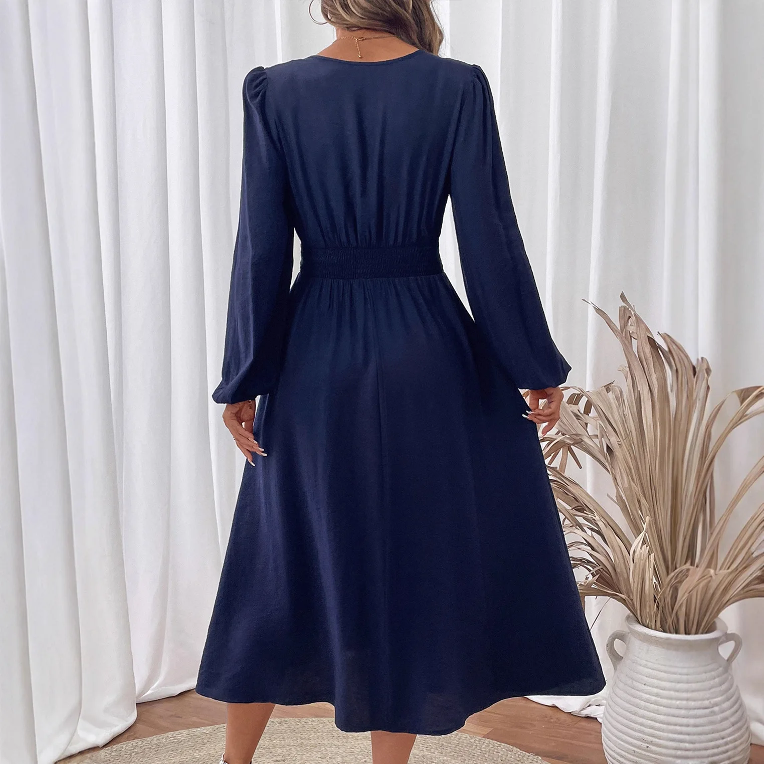 ZYHT 21541 Wholesale Crew Neck High Waist Casual Dresses Elegant Lace Velvet Mermaid Hem Ruched Long Sleeve Dresses for Women