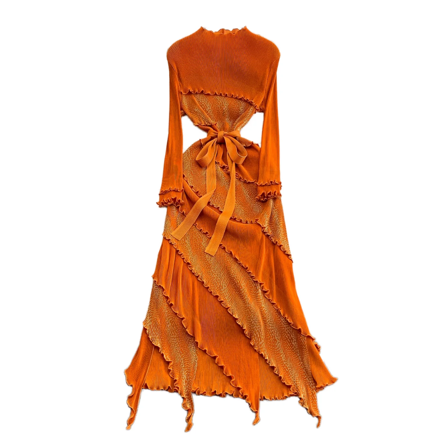 ZYHT 73849 European Wholesale Fashion Casual One Shoulder Ruched Maxi Dress Side Slit Pleated Long Sleeve Dresses for Women