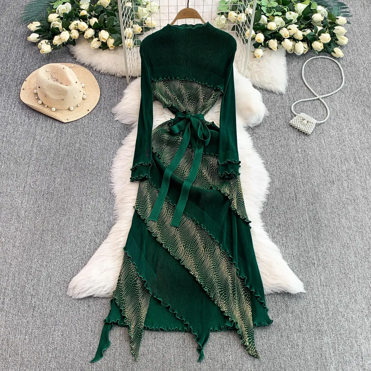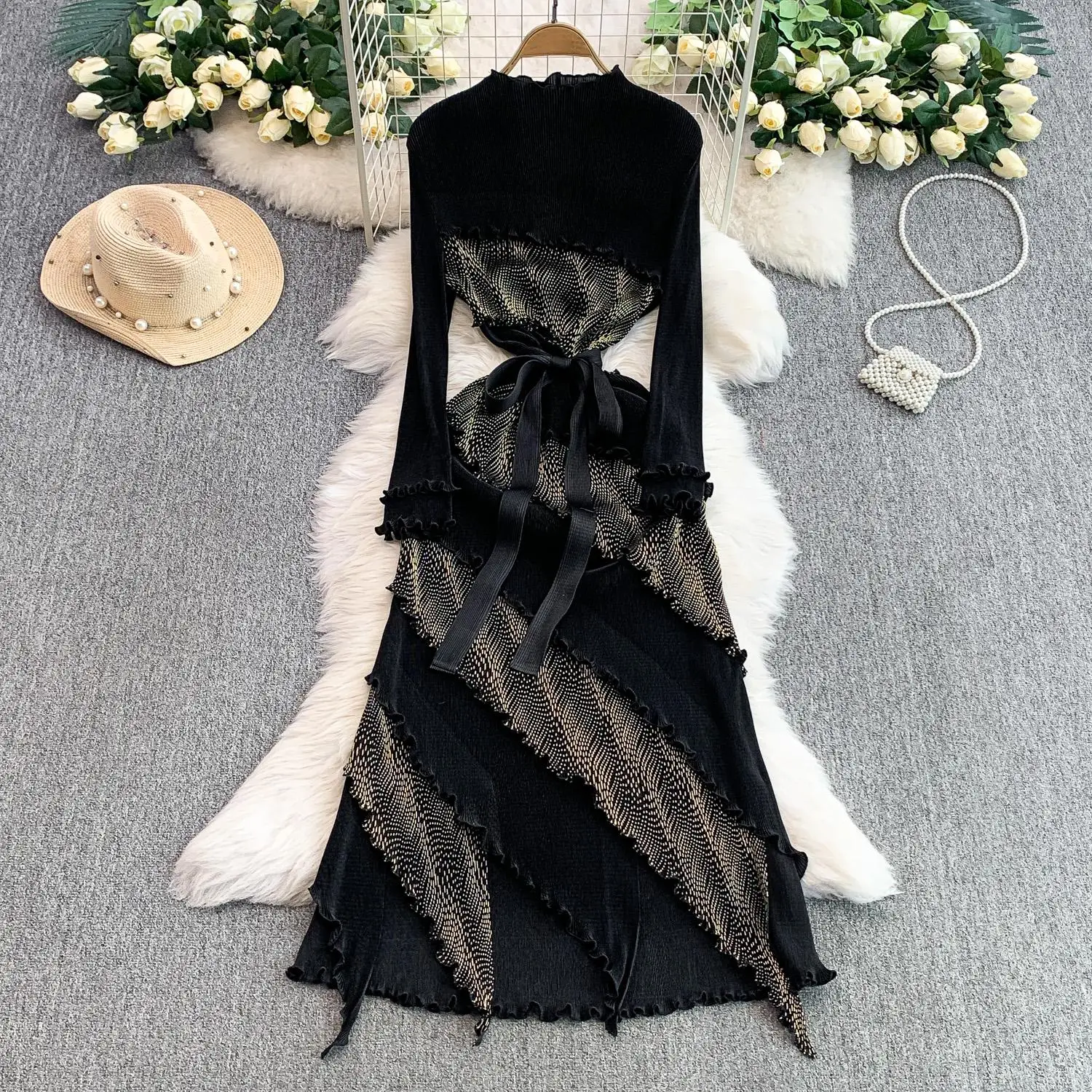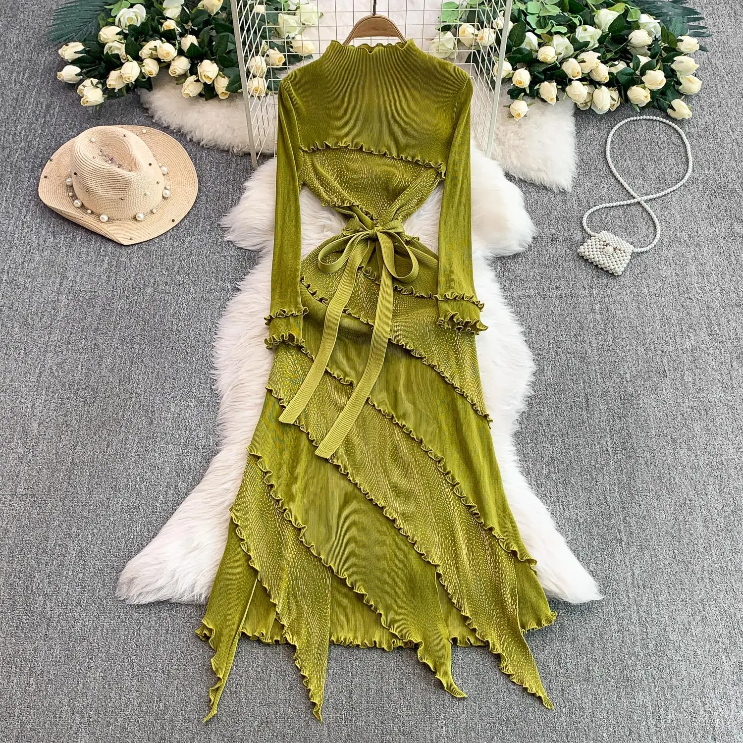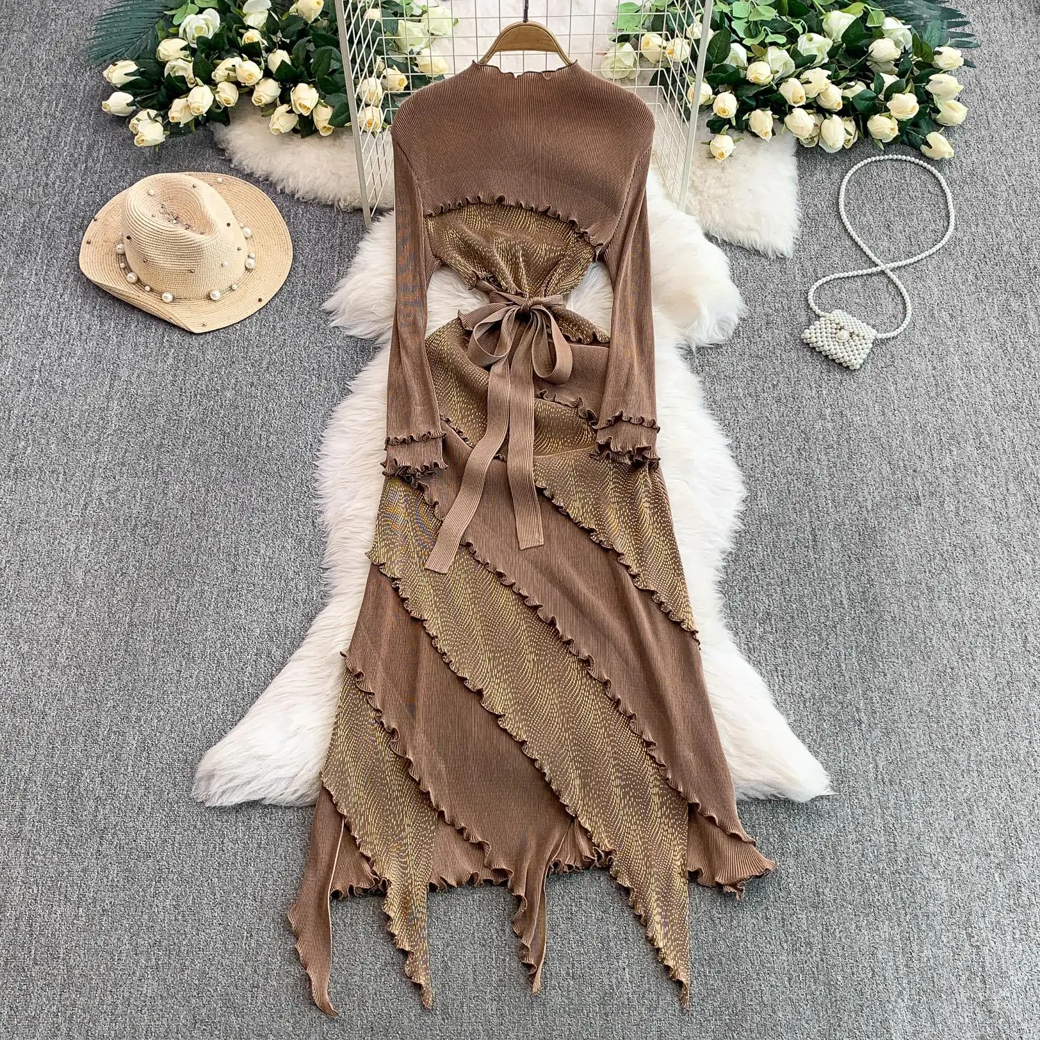 ZYHT 21541 Wholesale Crew Neck High Waist Casual Dresses Elegant Lace Velvet Mermaid Hem Ruched Long Sleeve Dresses for Women