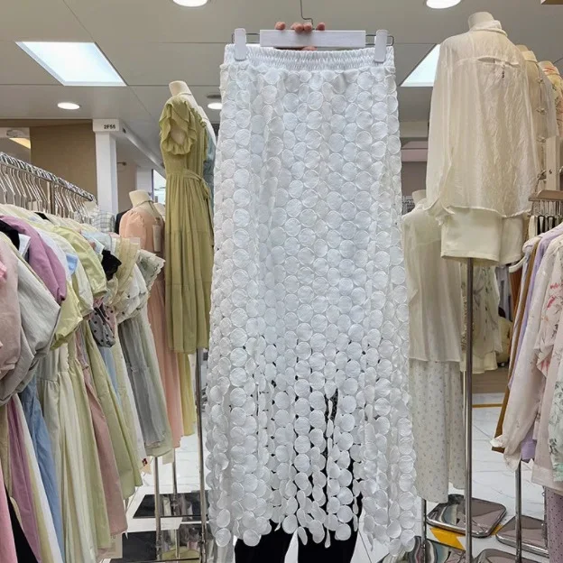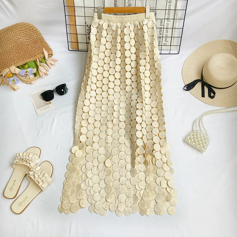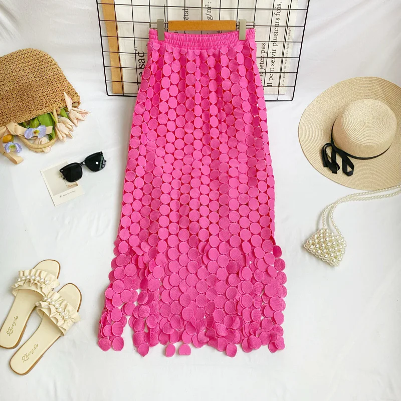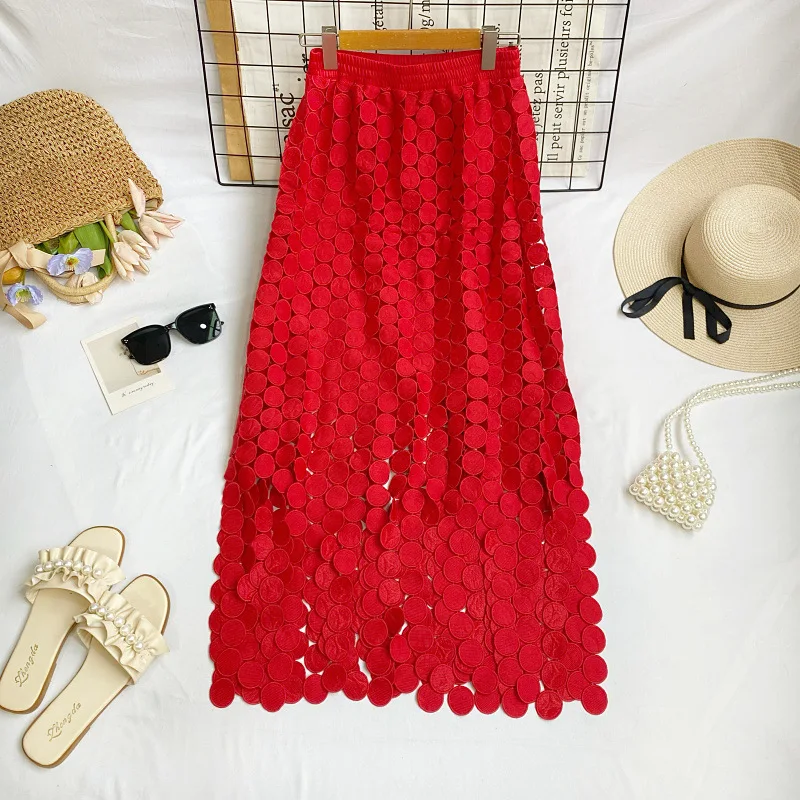 Summer New Fashion Women's High Waist Tassel Skirt French A-Line Irregular Hollow-out High-grade Plain Dyed Casual Style