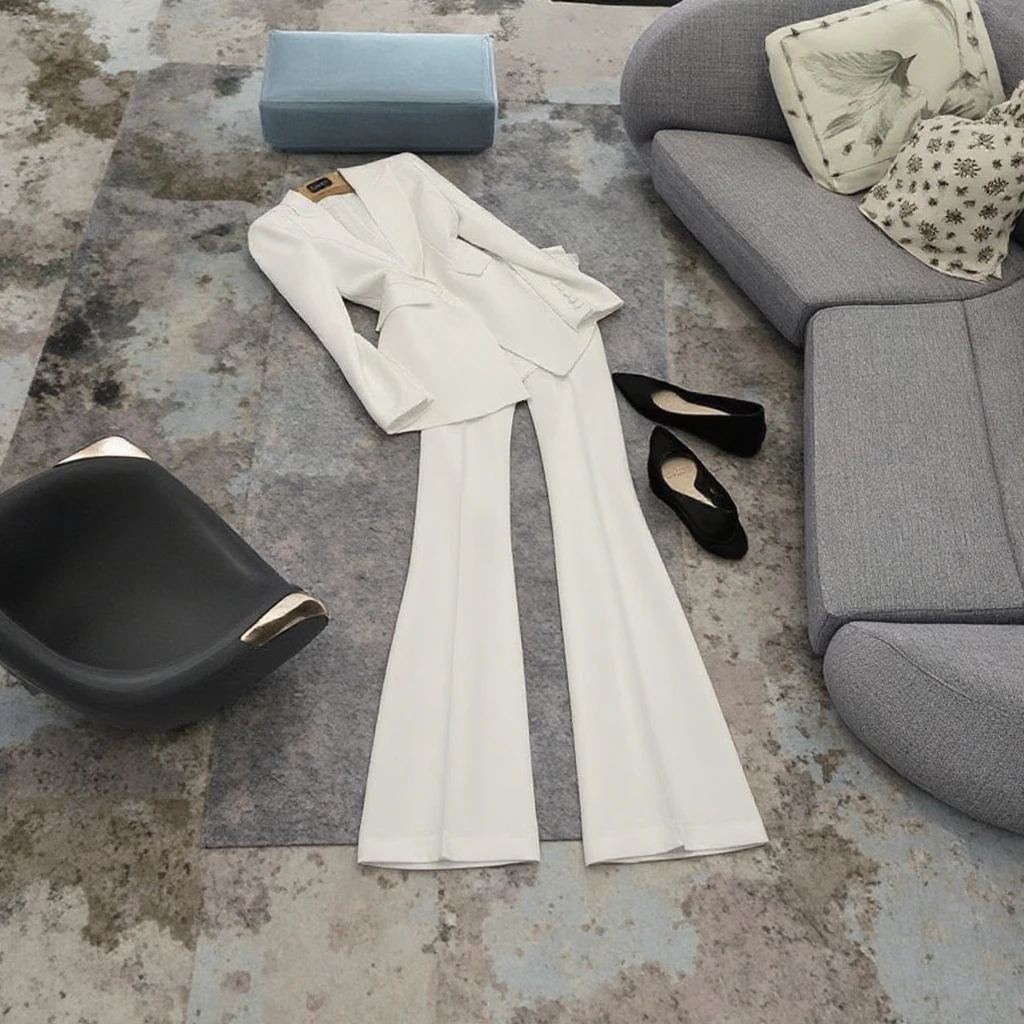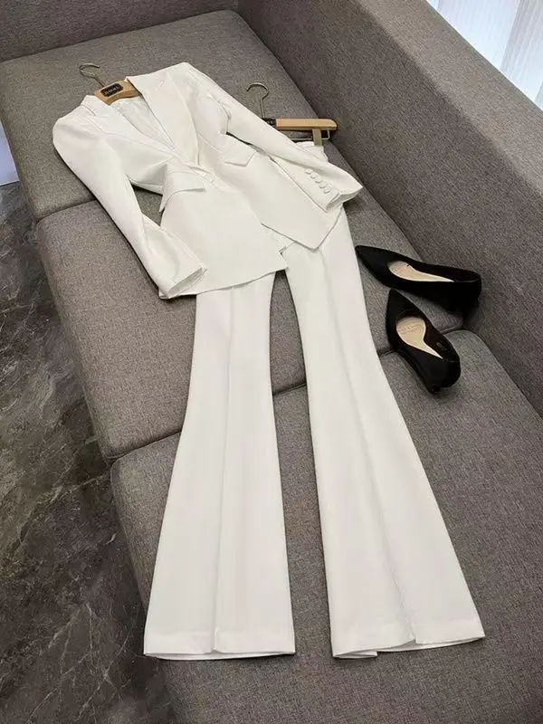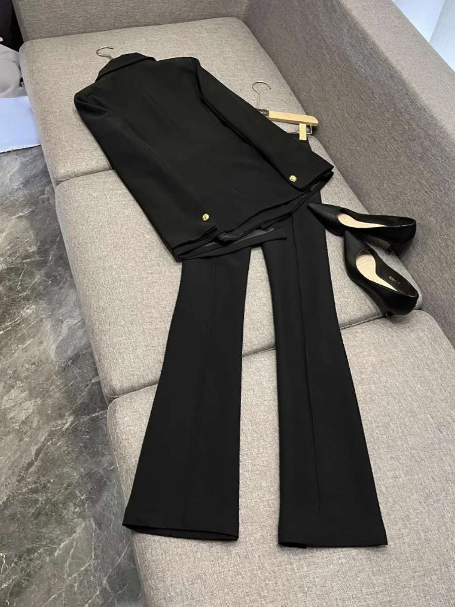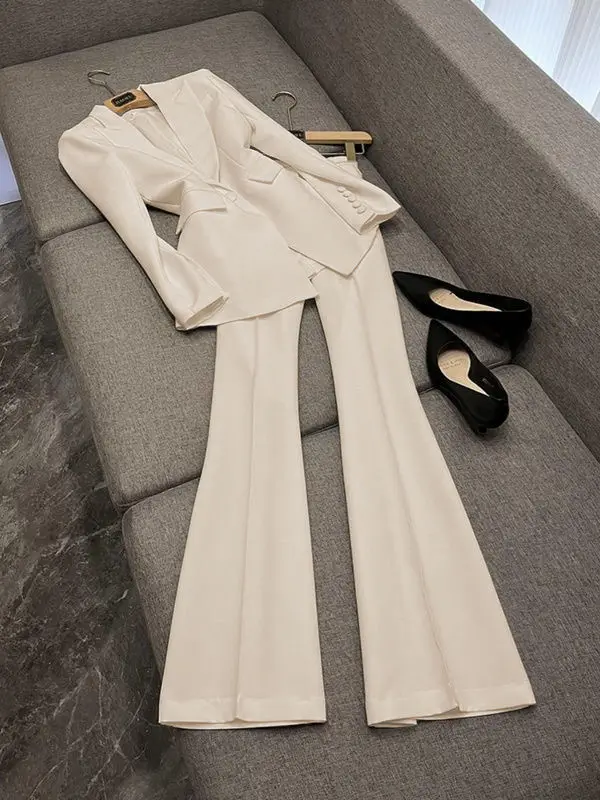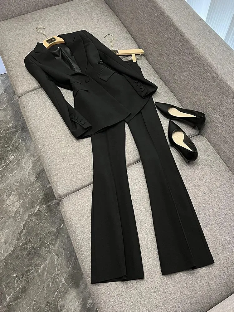 High Quality Lady Office Suit Long Sleeve Blazer Flared Pants Solid Color 2Pcs Button Decoration Made Polyester
