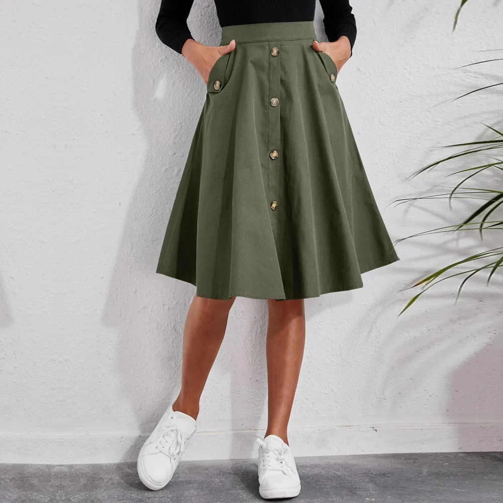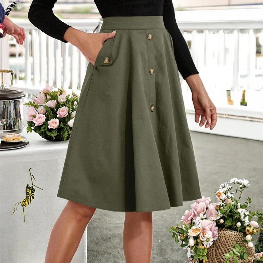 Baggy High Waist Midi Skirts for Women Ladies French Pocket Empire Style Breathable with Button Decoration for Autumn