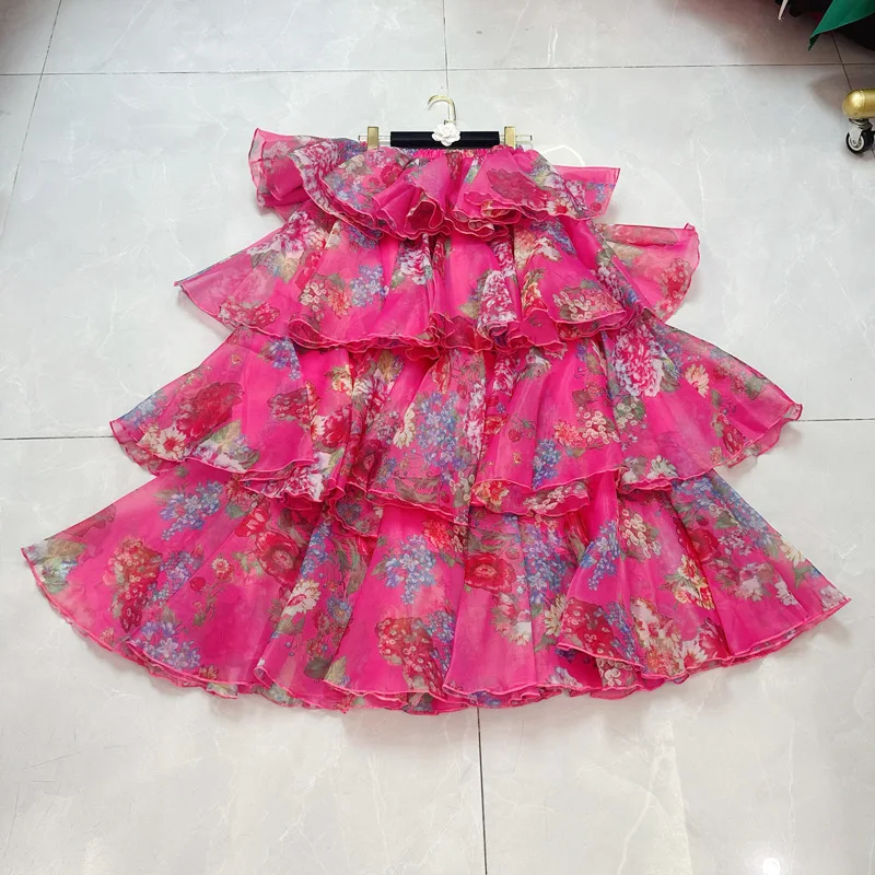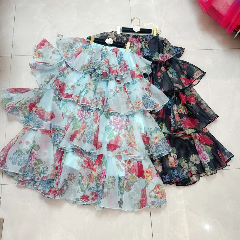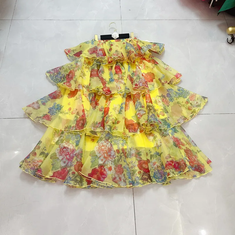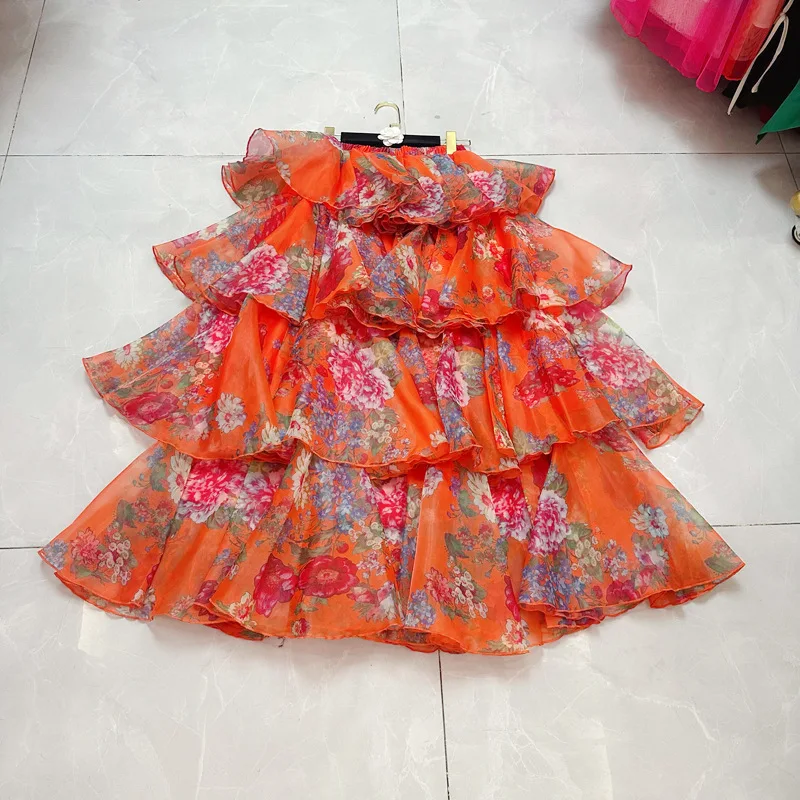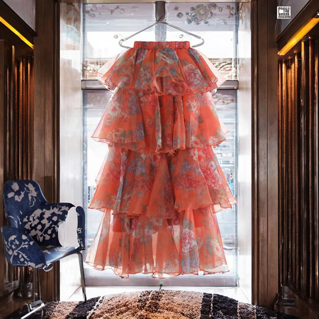 Women's Casual Long Midi Skirt Western Style with Sweet Embroidery and Ruffles Empire Waistline Printed