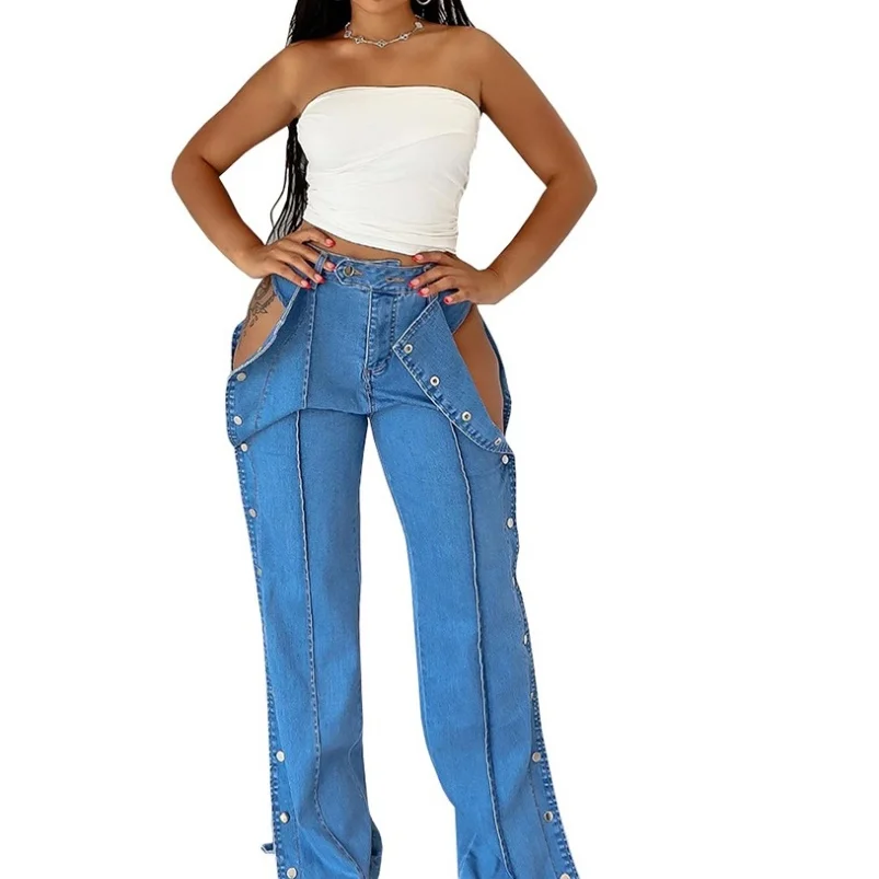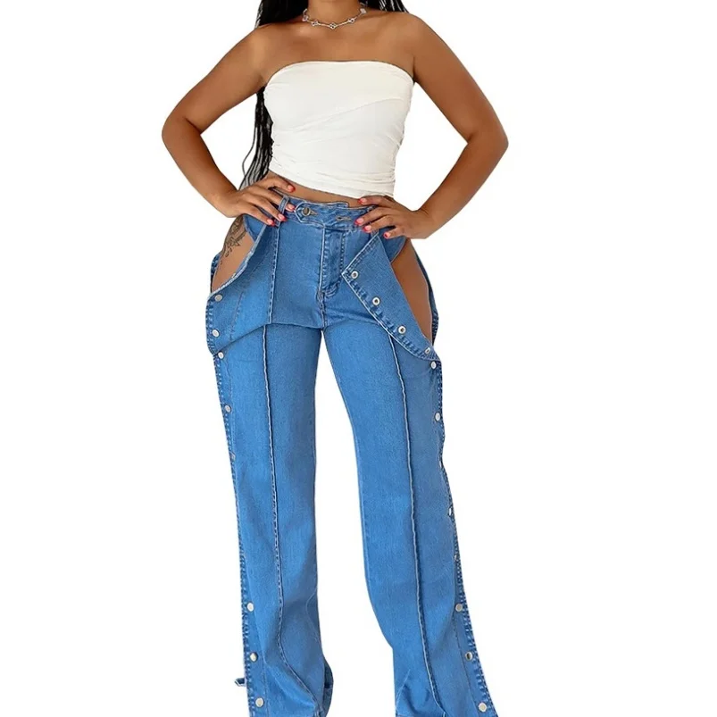 Viviblook Z610PT06 Women Denim Summer Fashion High Waisted Jeans Street Double-sided Button Closed Casual Plus Size Pants