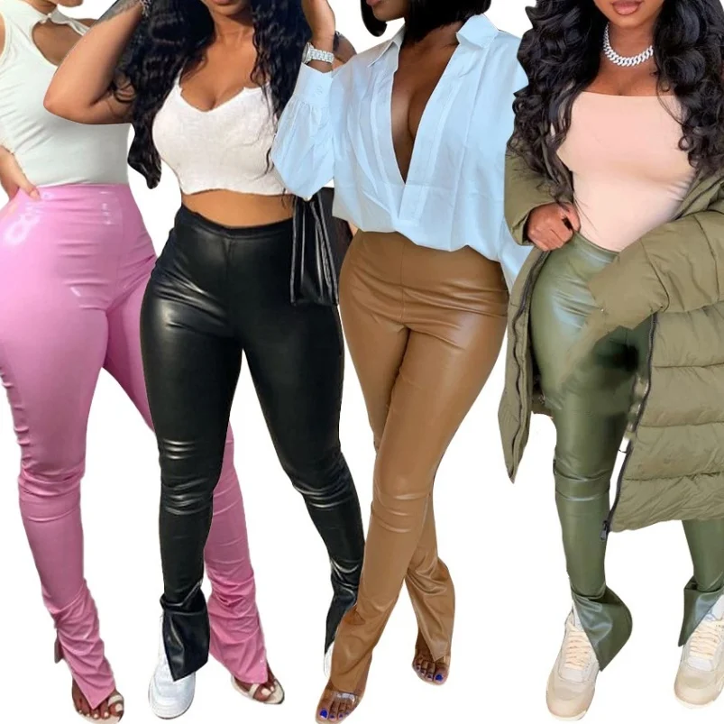 Viviblook Z1010PT02 Women Autumn Fashionable Side Slit Sexy Flared PU Leather Pants Casual Pants for Women