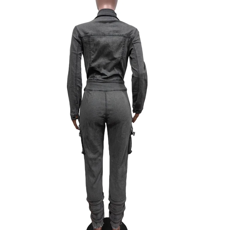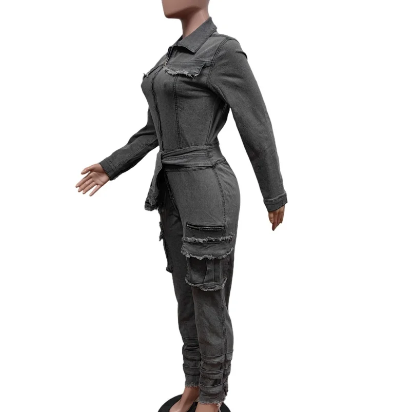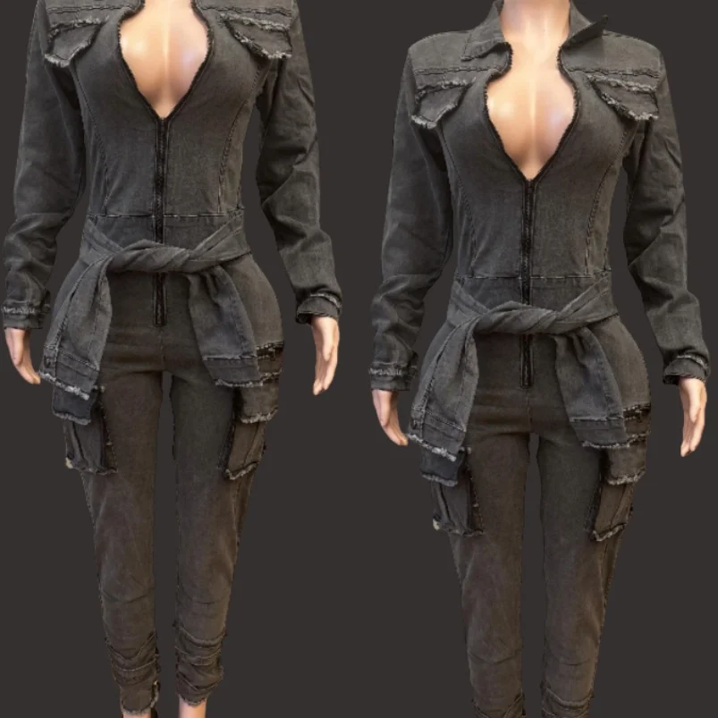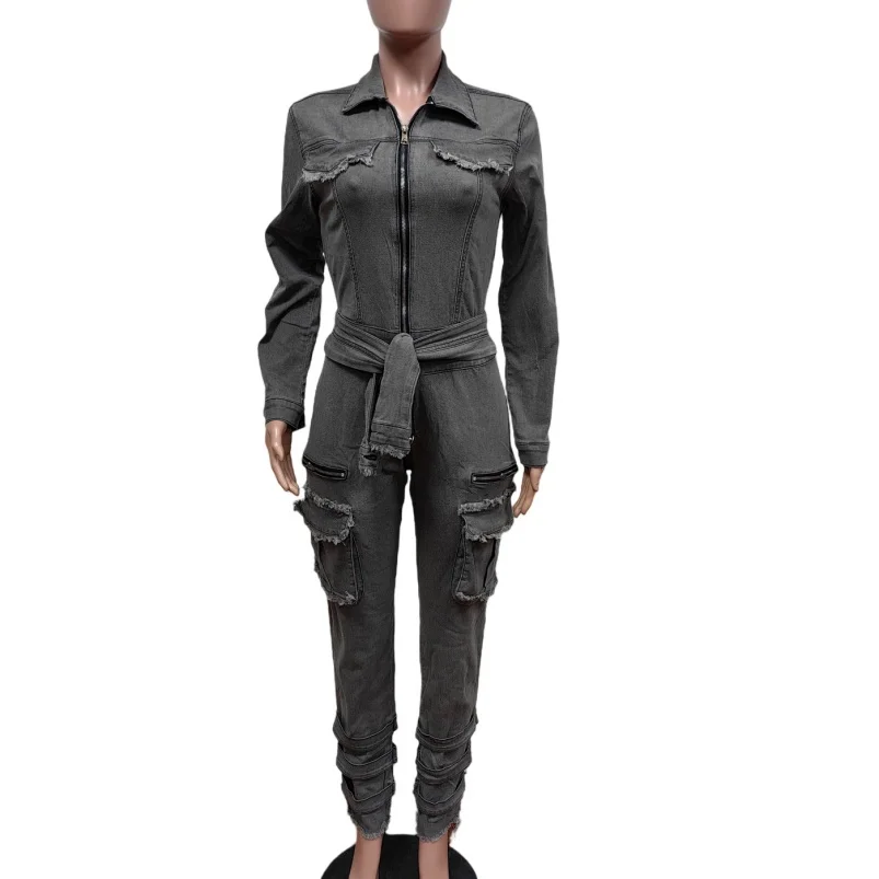 Viviblook Z702JP04 2026 New Hot Selling Elastic Slim Fit Jumpsuit for Women New Denim Lace up Waistband Plus Size Jumpsuit