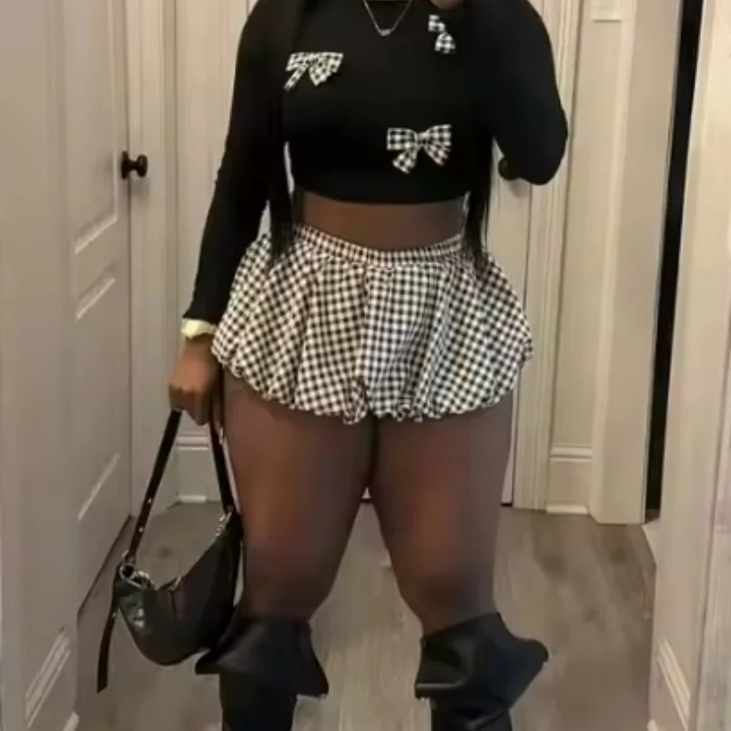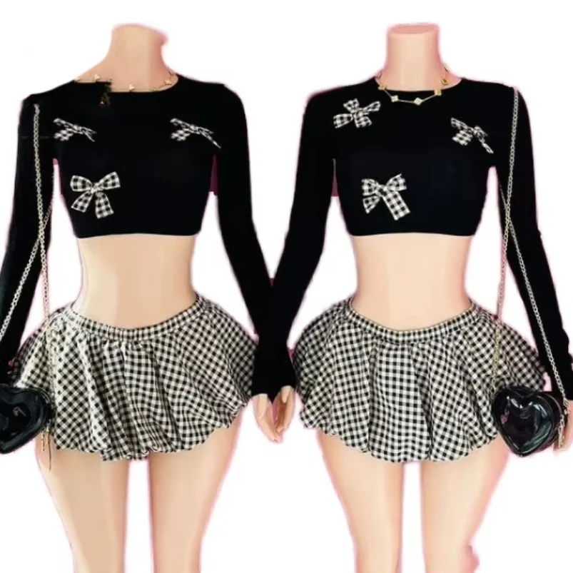 Viviblook F24ST322 New Outfit Bow Crop Shirt and Shorts Bubble Skirt 2 Piece Set Y2K Cute Two Piece Set Bubble Skirt for Women