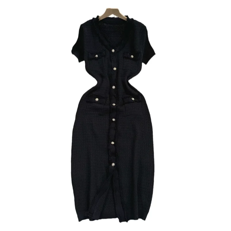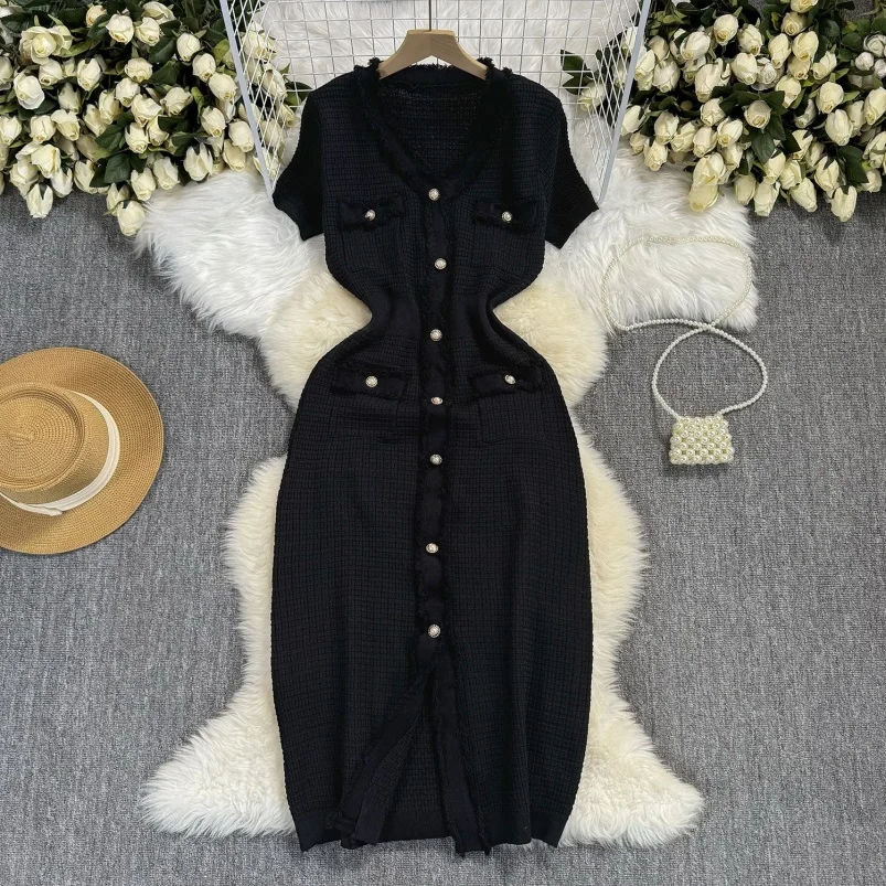 Viviblook Z412DS01 Women Summer Short Sleeved Slim Fit V-Neck Buckle Knit Elegant Dress for Women Maxi Sexy Dress