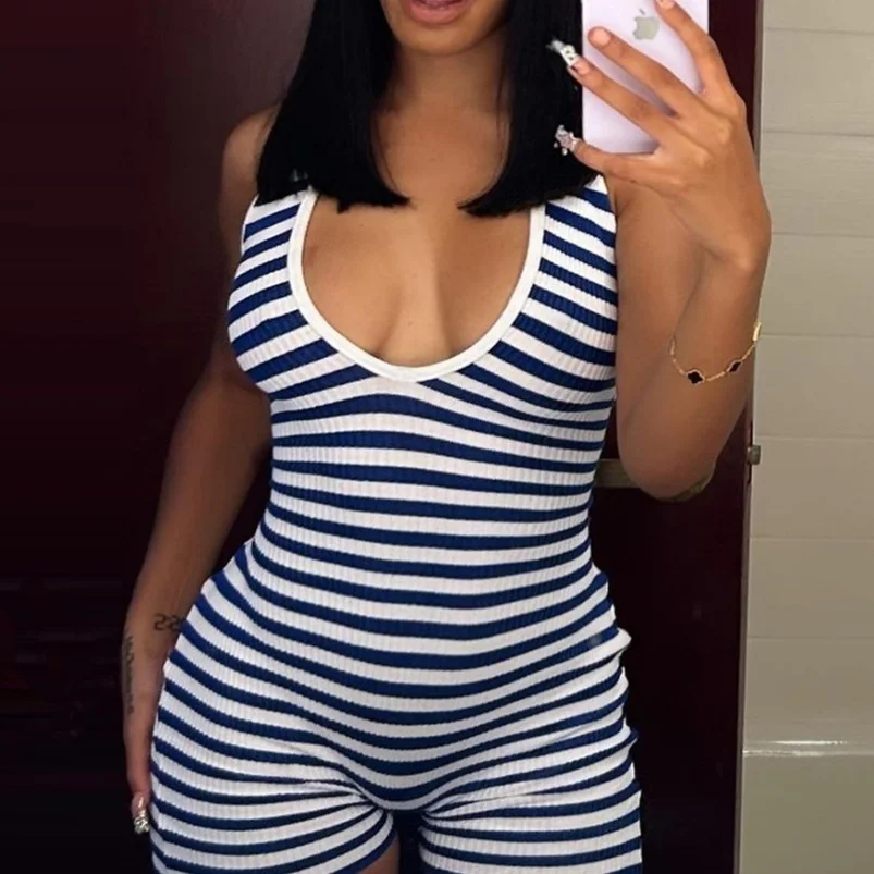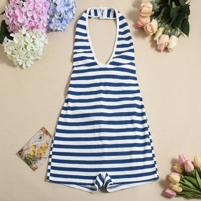 Viviblook Z606RP01 Summer Rompers for Women Summer Hot New Slim Fit Strap Hanging Neck Stripe Jumpsuit One Piece Rompers Bodycon