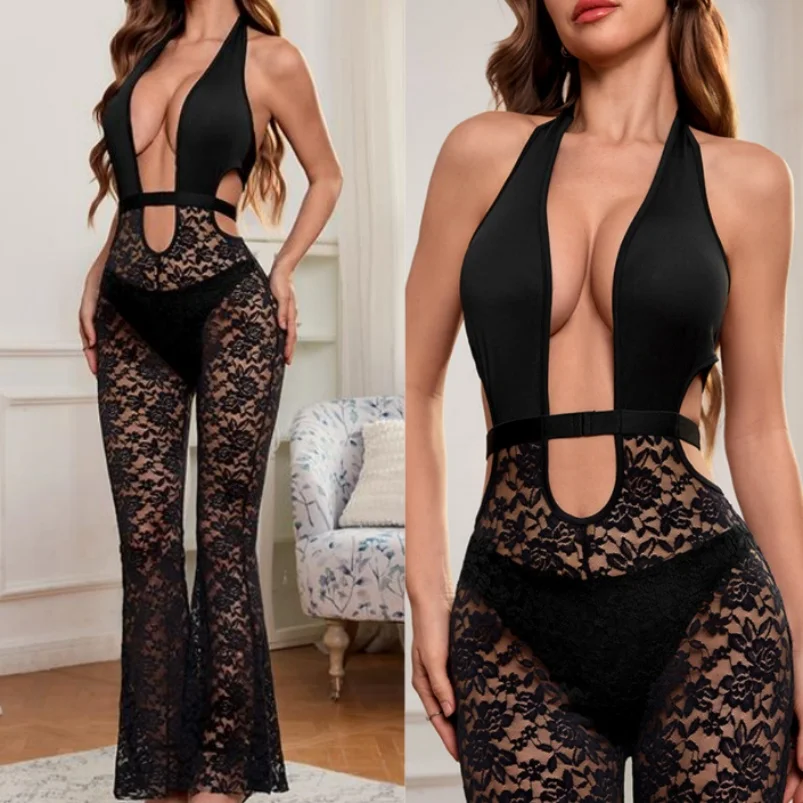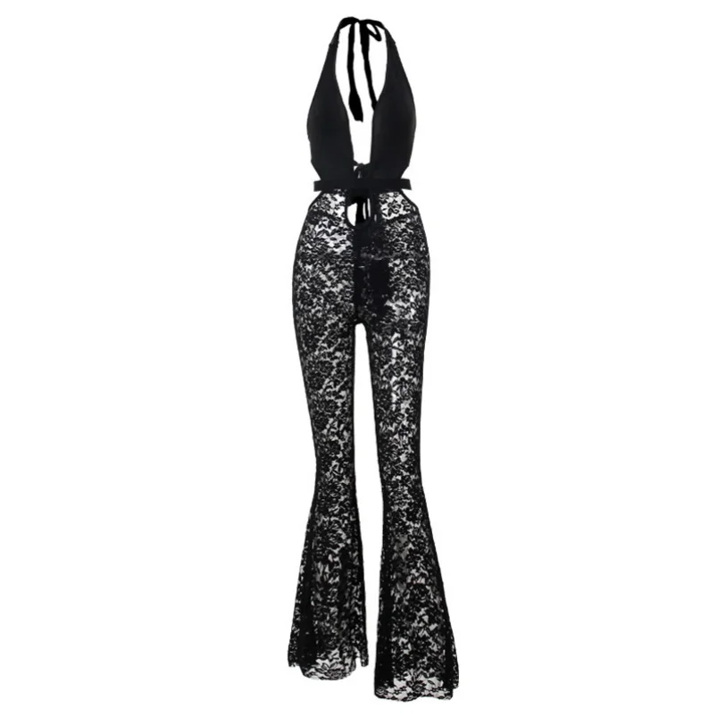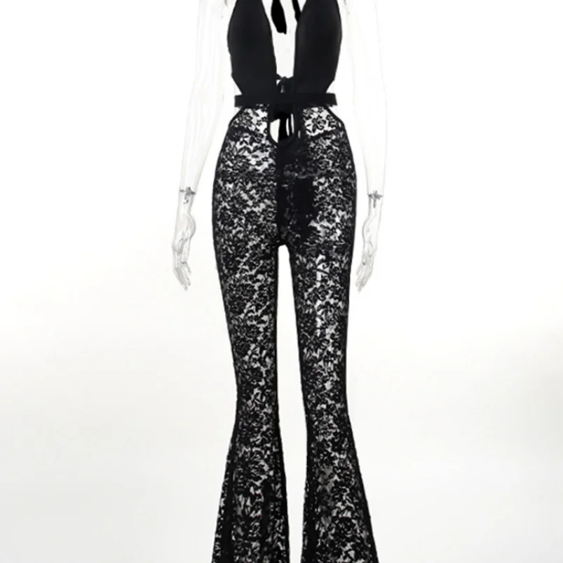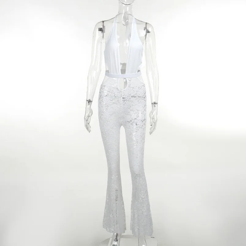 Viviblook Z927JP02 Club Wear Sexy Hollow Lace See Through Hollow Flared Jumpsuit One Piece Sexy Bodycon Jumpsuits for Women