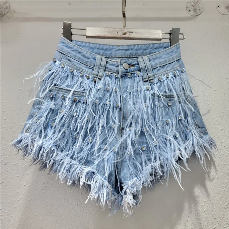 Viviblook C509PT01 Summer Hot Shorts Denim Beading Mid Waist Shorts for Women Distressed Jean Shorts With Tassels