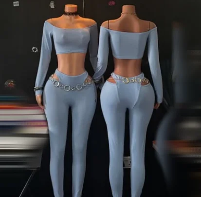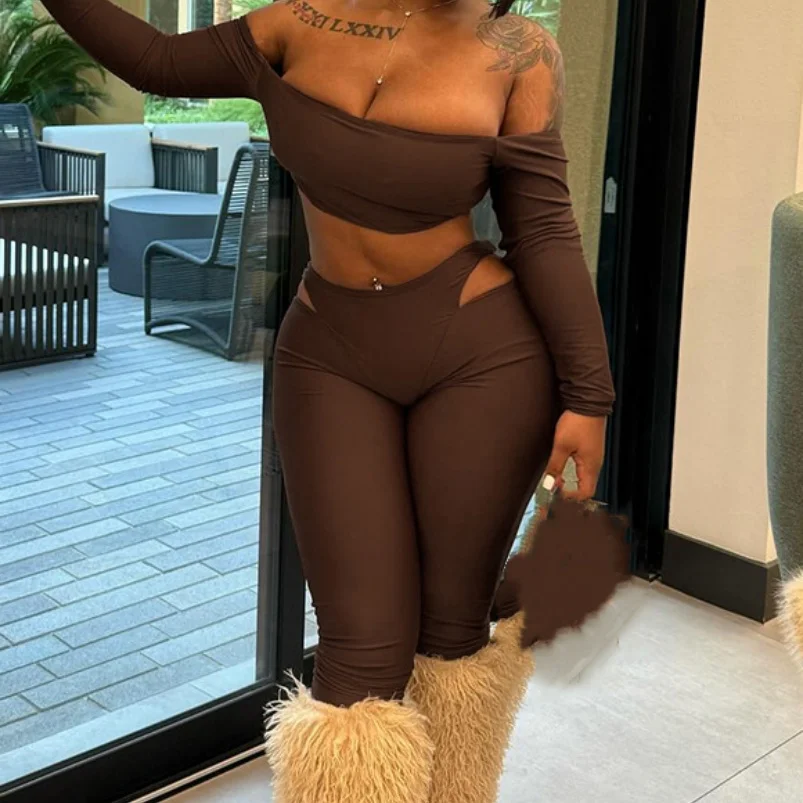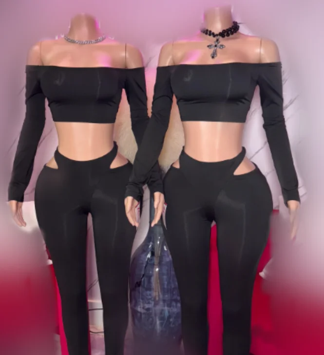 Viviblook J25ST318 Autumn Winter Outfits Sexy Long Sleeved Crop Top with Hollowed Out Tight Pants 2 Piece Set for Women