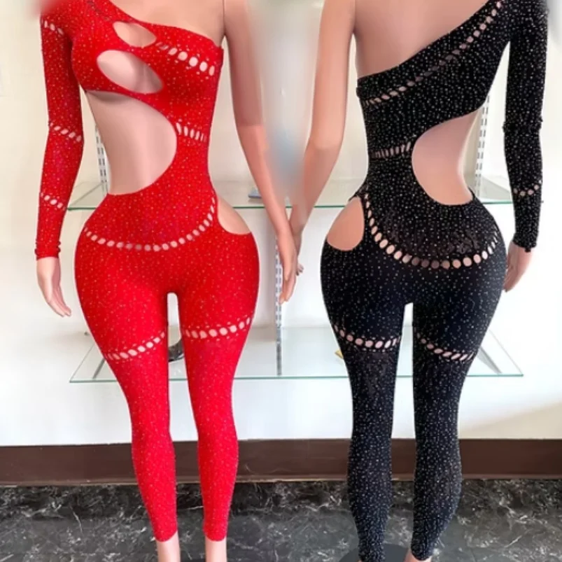 Viviblook Z702JP01 Sexy Rhinestone Slash Shoulder See Through Hollow Out Jumpsuit Women Bodycon