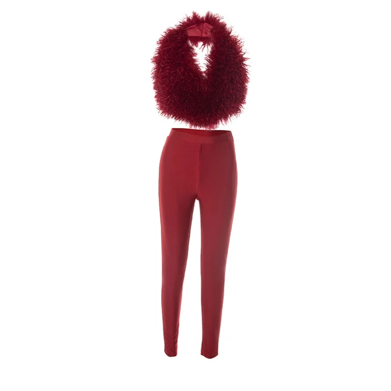 Viviblook C25ST141 New Outfits Sexy Fur Collar Set Halter Lace up Backless Strap Crop Top Tight Pants 2 Piece Set for Women