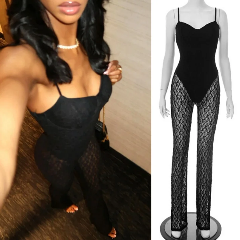 Viviblook C25JP067 Women's Sexy Lace Strapless Suspender Backless Mesh See Through Casual Jumpsuits for Ladies Bodycon
