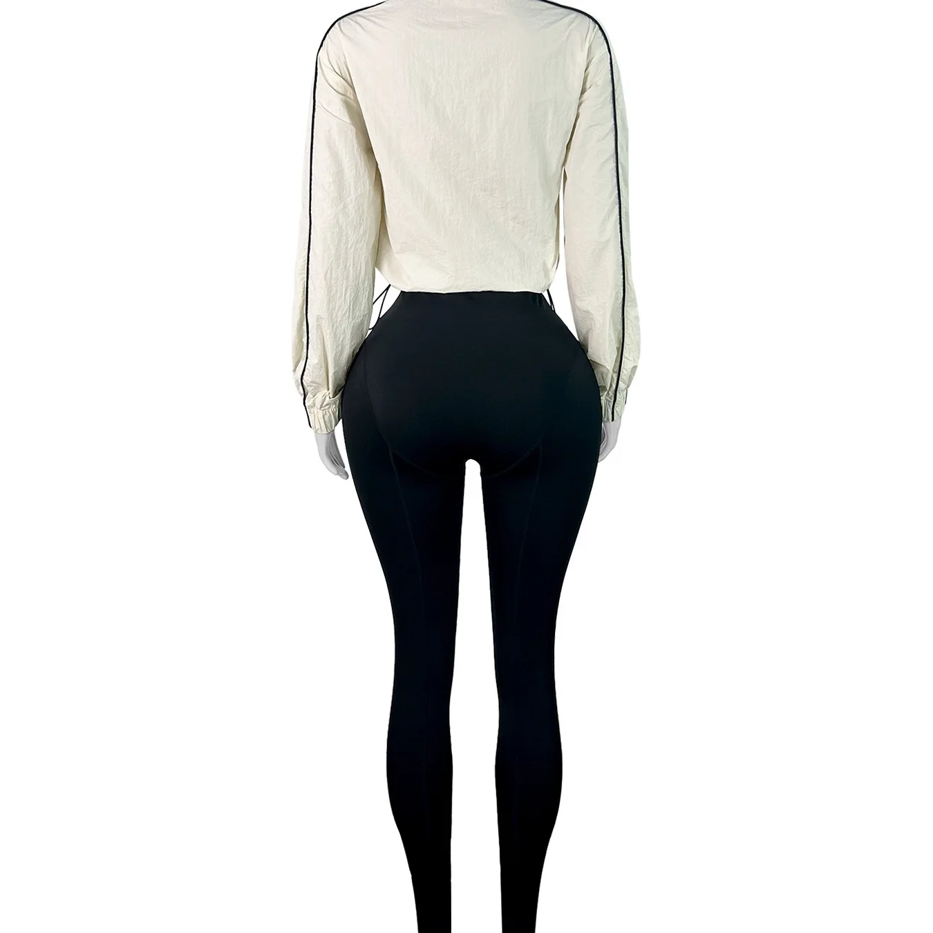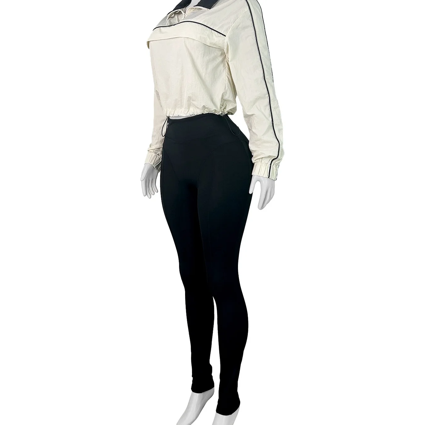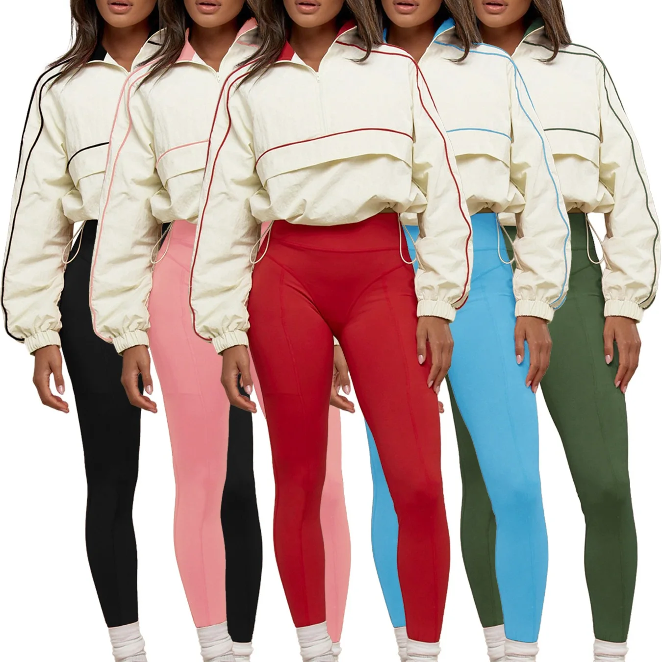 Viviblook Z1226ST03 Women's Suit Color Blocking Drawstring Waistband Crop Top Yoga Pants Sports Two Piece Casual Set