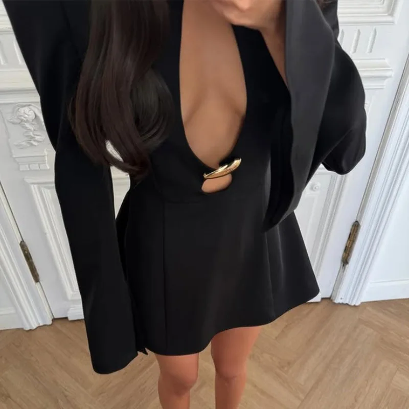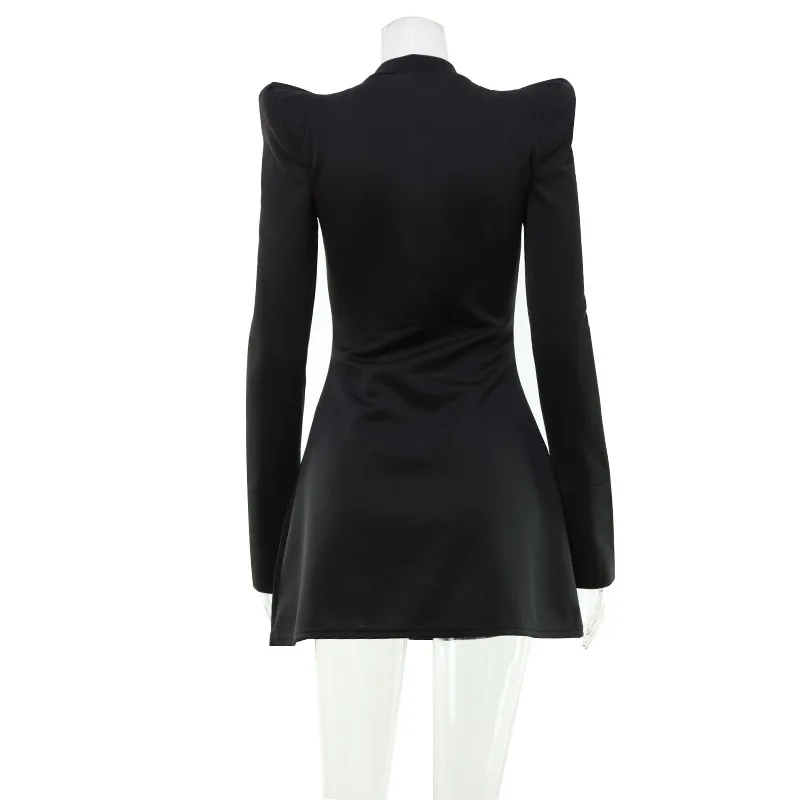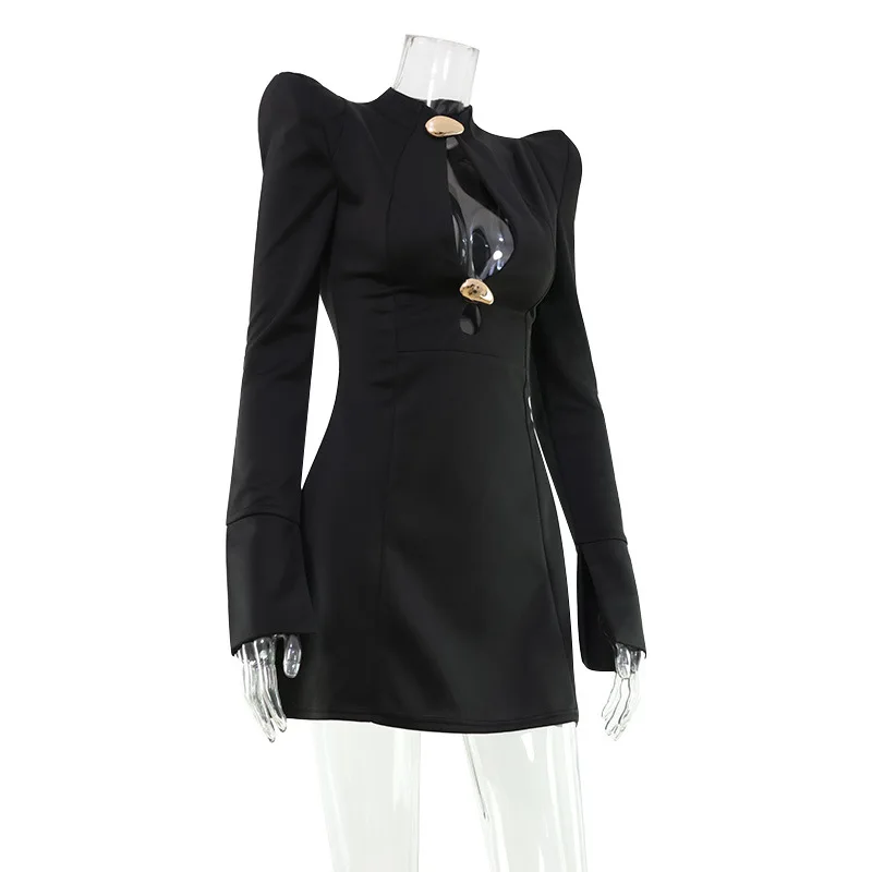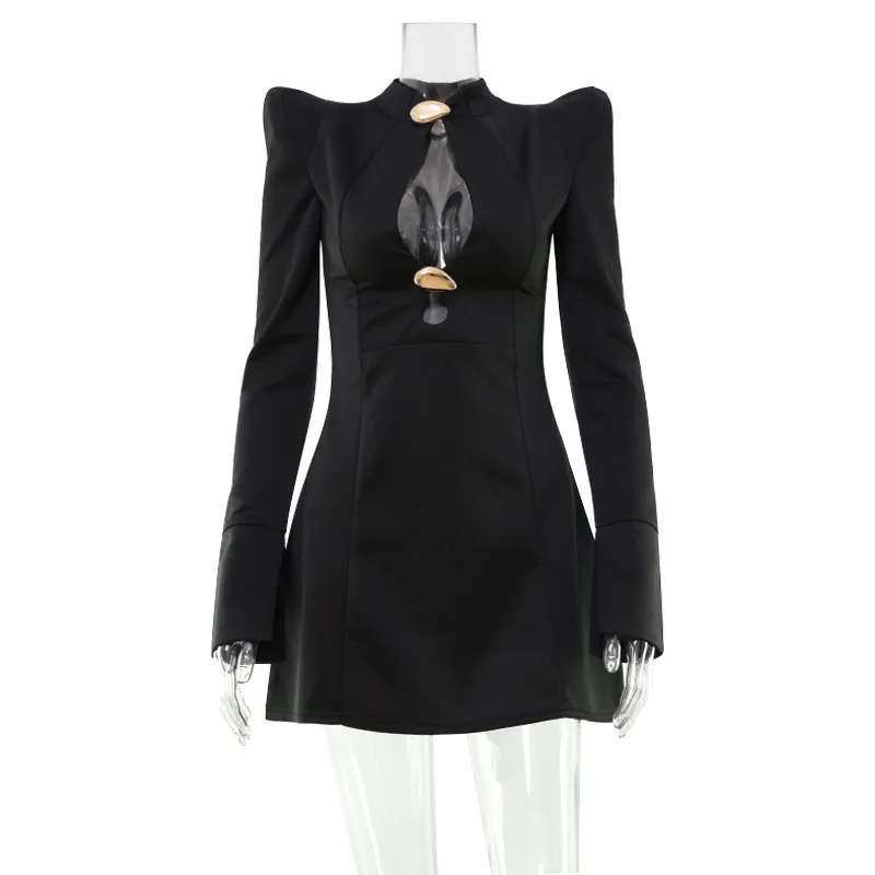 Viviblook Z1229DS01 Women Dresses Hollow Out Sexy Shoulder Pad Solid Color Long Sleeved Waist Cinching Mini Party Dress