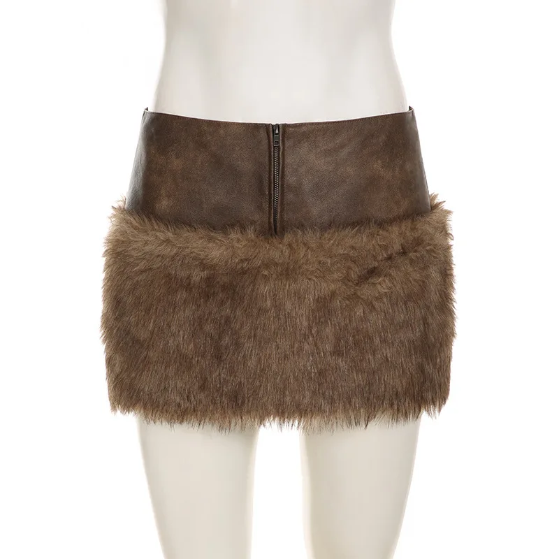 Viviblook Z1108SK Women's Skirts New Spicy Girl Sexy Low Waist Mini Skirt Fur Patchwork Zipper Leather Skirt