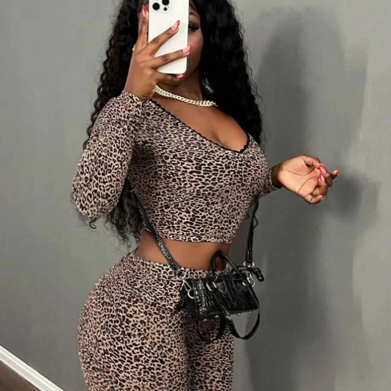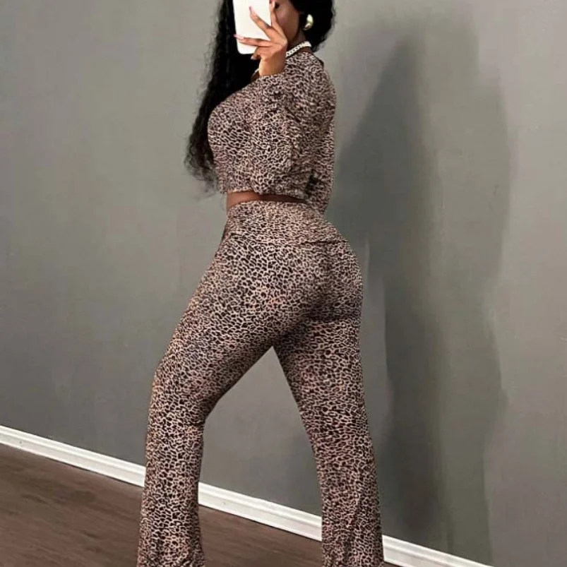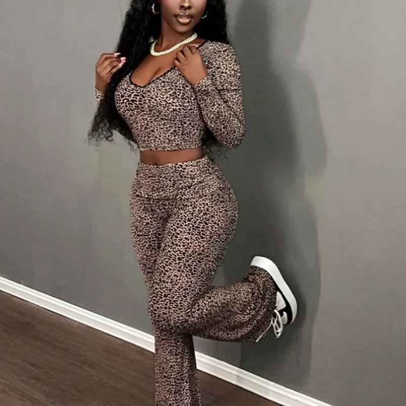 Viviblook Z215ST07 Spring V Neck Lace Leopard Print Sexy Casual High Waist Set Outfit Suit 2 Piece Pants Set for Women