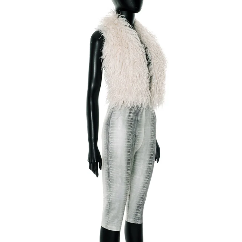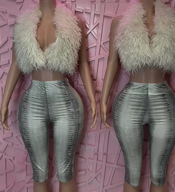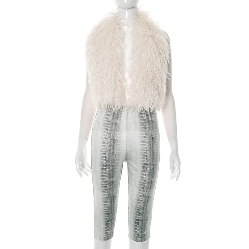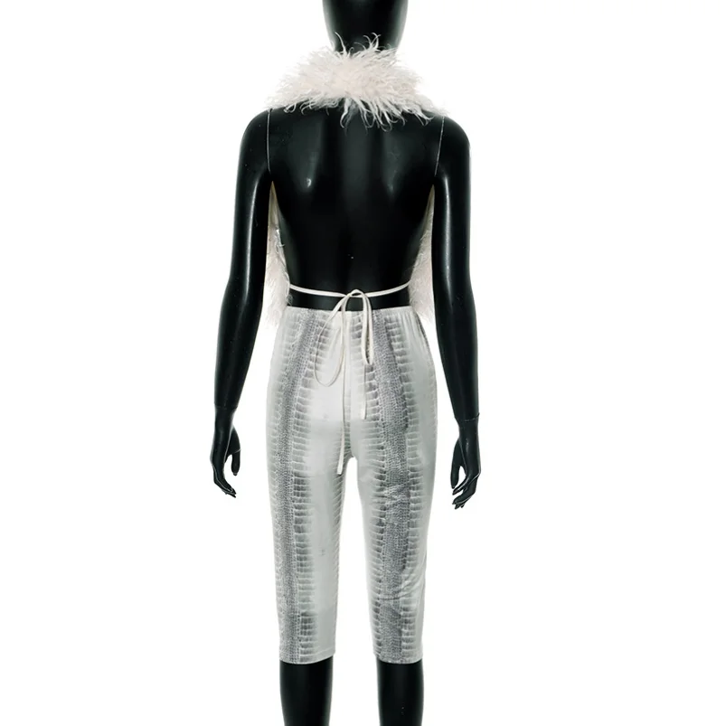 Viviblook J25ST158 2026 New Fur Collar Set Sexy Halter Backless Top Snake Print Cropped Pants Two-piece Set for Women