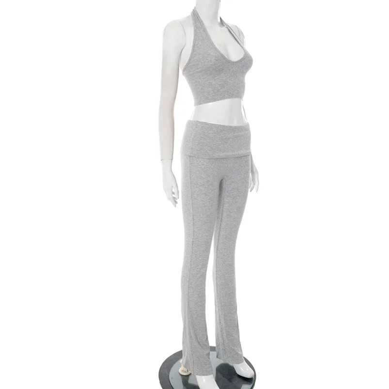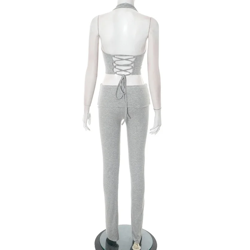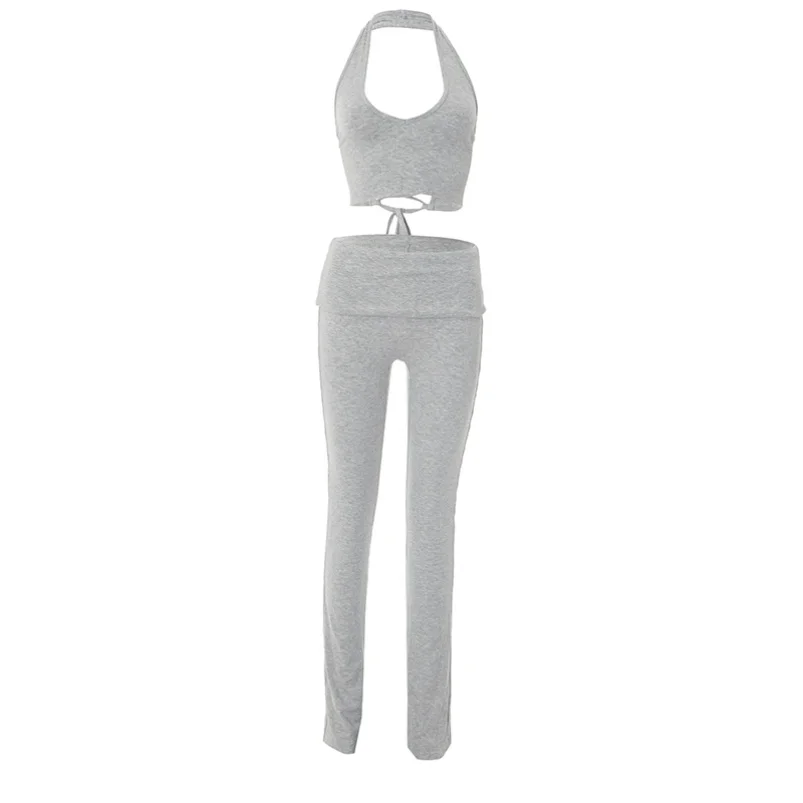 Viviblook D25ST235 Sexy Threaded Sleeveless Halter Lace up Vest Folding Pants Two-piece Set for Women Tracksuit