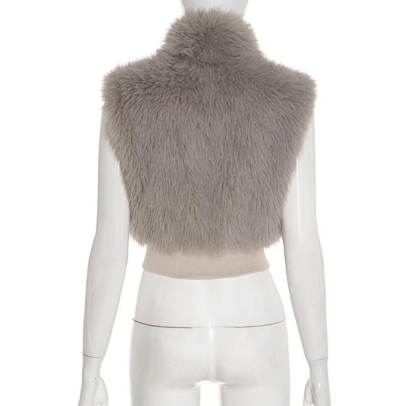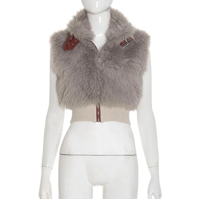 Viviblook C25TP258 New Autumn Winter Sleeveless Plush Zipper Cardigan Metal Leather Buckle Fur Vest Crop Top for Women