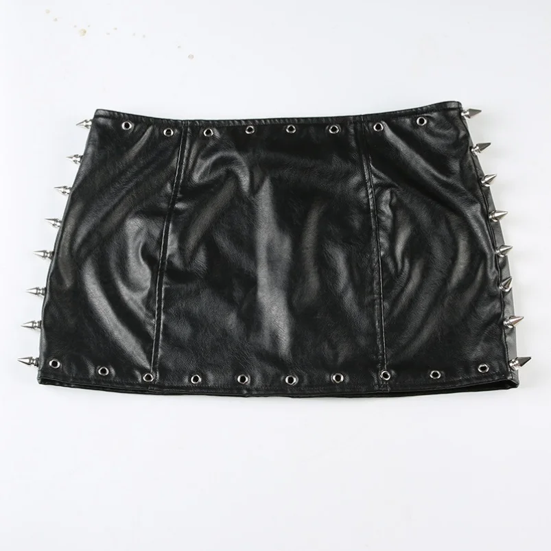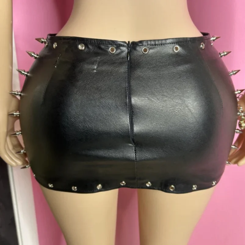 Vivblook Z928SK Women Vintage Aesthetic Rivet Short Skirt Sexy Gothic Pu Leather Black Mini Skirt