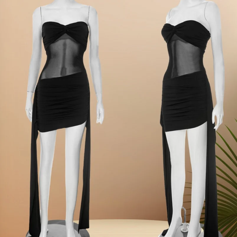 Viviblook C25DS152 New Elegant Strapless See Through Ribbon Mesh Patchwork Dresses for Women