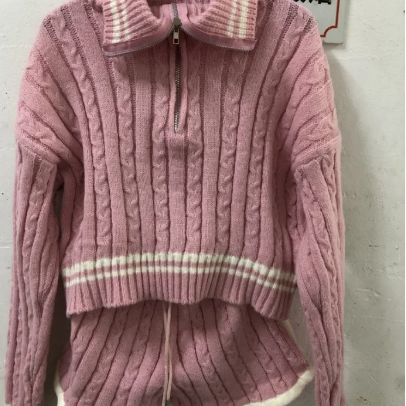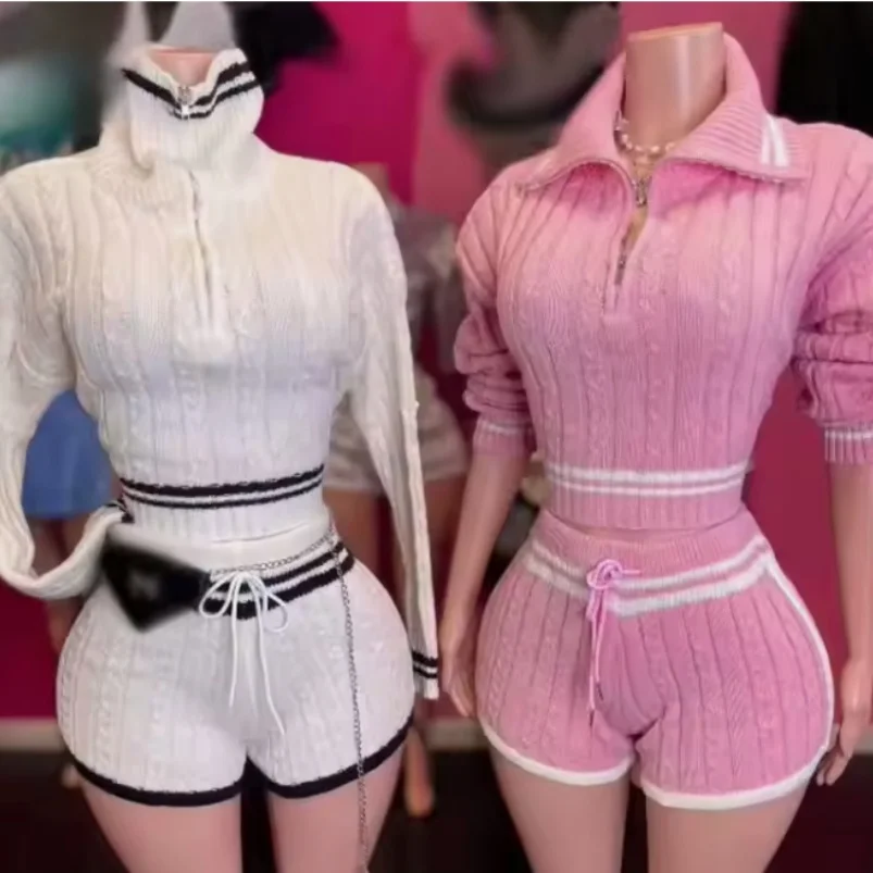 Viviblook Z913ST02 Autumn Women's New Outfit Thick Twist Knitted Sweater Set Contrast Color Shorts Suit Two Piece Set Women