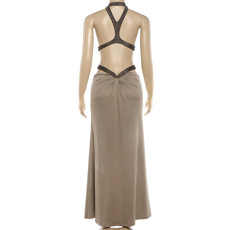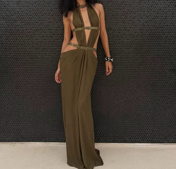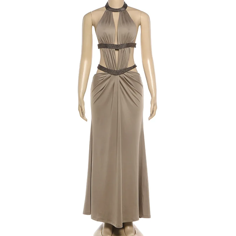 Viviblook Z1222DS01 New Women Elegant Dresses Sexy Hollow Out Backless Sequin Halter Off Shoulder Pleated Maxi Party Dress