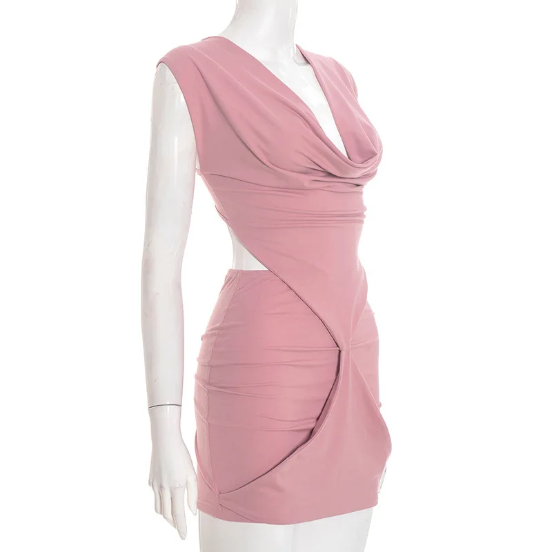 Viviblook Y25DS557 Women Summer Clothes New Solid Color Sexy Deep V-Neck Hollow Out Pleated Sleeveless Mini Dress
