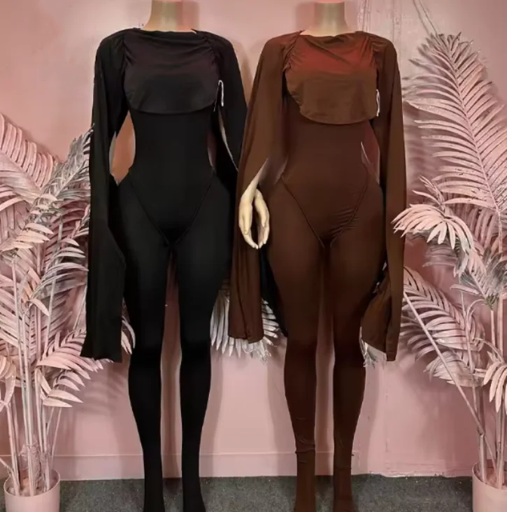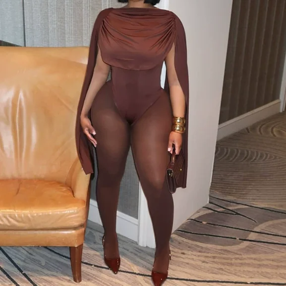 Viviblook Z1226JP01 Women's Casual Jumpsuit Pleated Tight O-neck Ruched Shawl Sleeves One Piece Jumpsuit