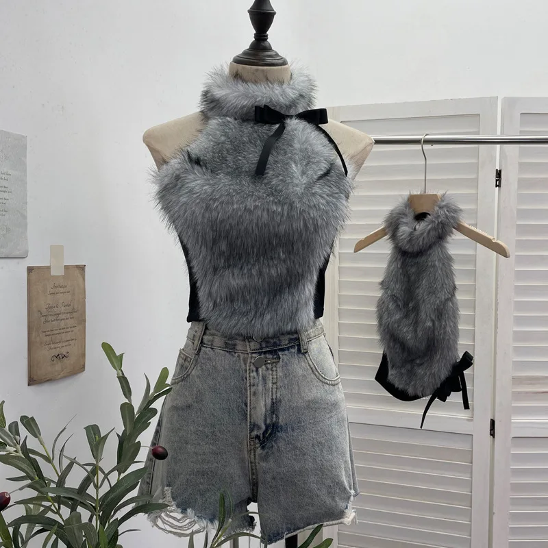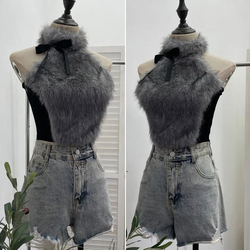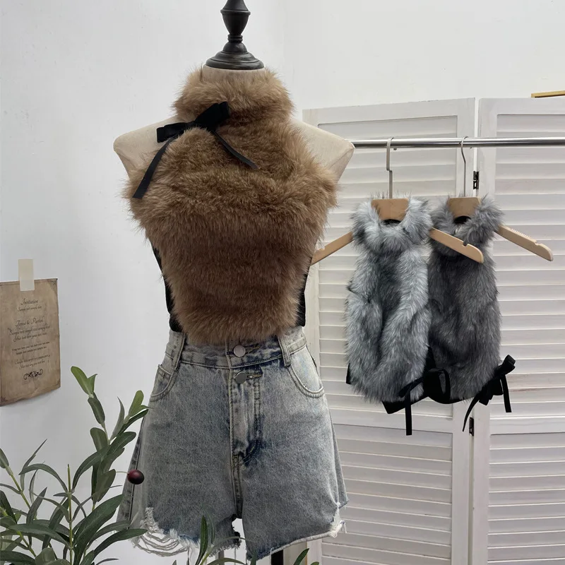 Viviblook Z1031TP02 Sexy Bow Furry Splicing Elastic High Collar Sleeveless Vest Y2k Faux Fur Crop Tank Top for Women