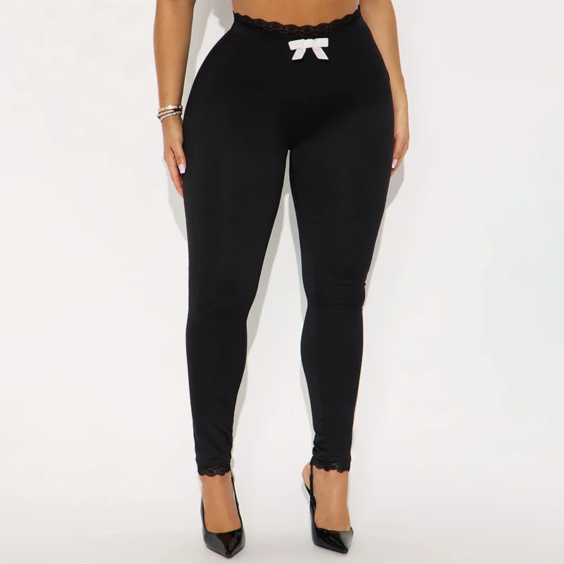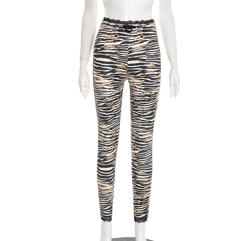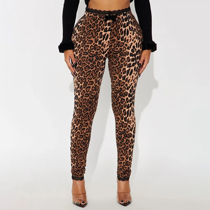 Viviblook J25PT367 Autumn New Women's Casual Pants Printed Lace Edge High Waist Yoga Leggings