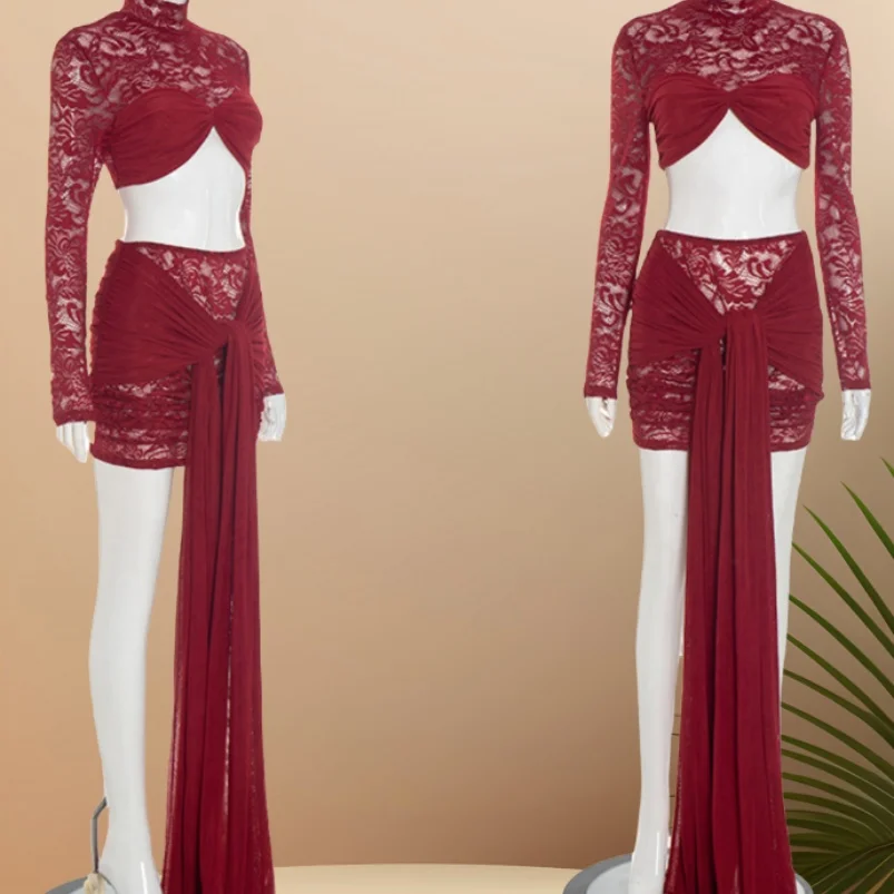 Viviblook D25ST402 Autumn Sexy Women's Set Sexy Lace Mesh Long Sleeve Crop Top Tie-up Mini Skirt Set 2 Pieces Set for Ladies