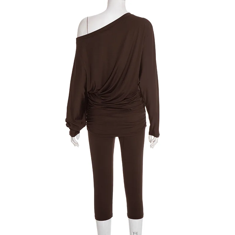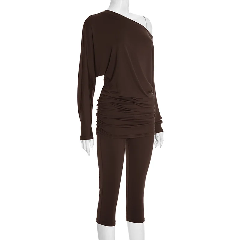 Viviblook J25ST373 Women's Set Slash Shoulder Loose Long Sleeved Top Tight Fitting Cropped Pants Casual Suit