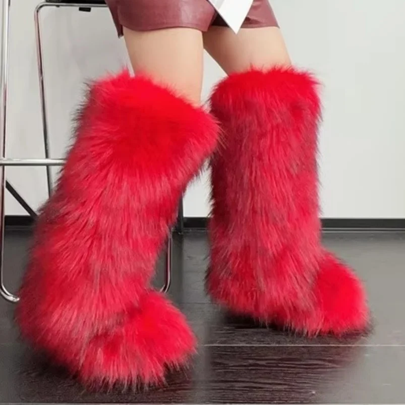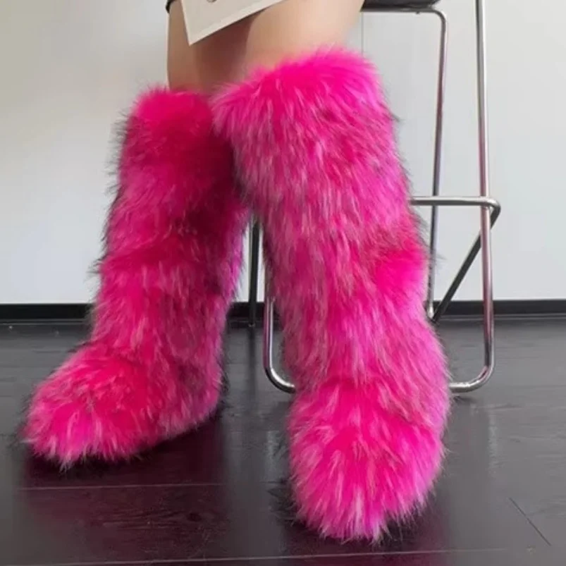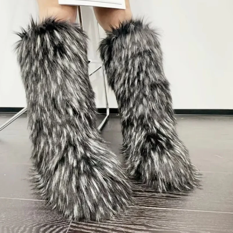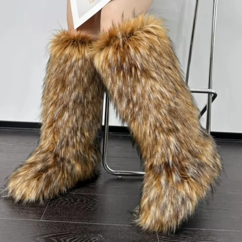 Viviblook Z1219BT Women Winter Thigh High Fluffy Boots Furry Faux Fox Fur Long Warm Shoes New Designer Plush Knee High Fur Boots