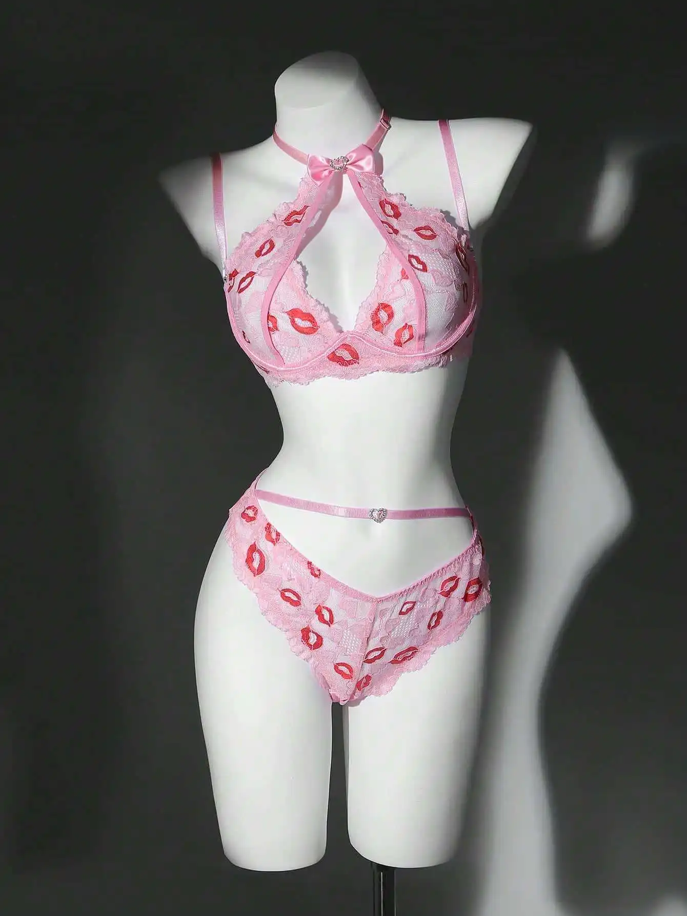 2026 Cross Border Valentine's Day New Manufacturer Wholesale Embroidered Lipstick Printed Sexy Underwear Set