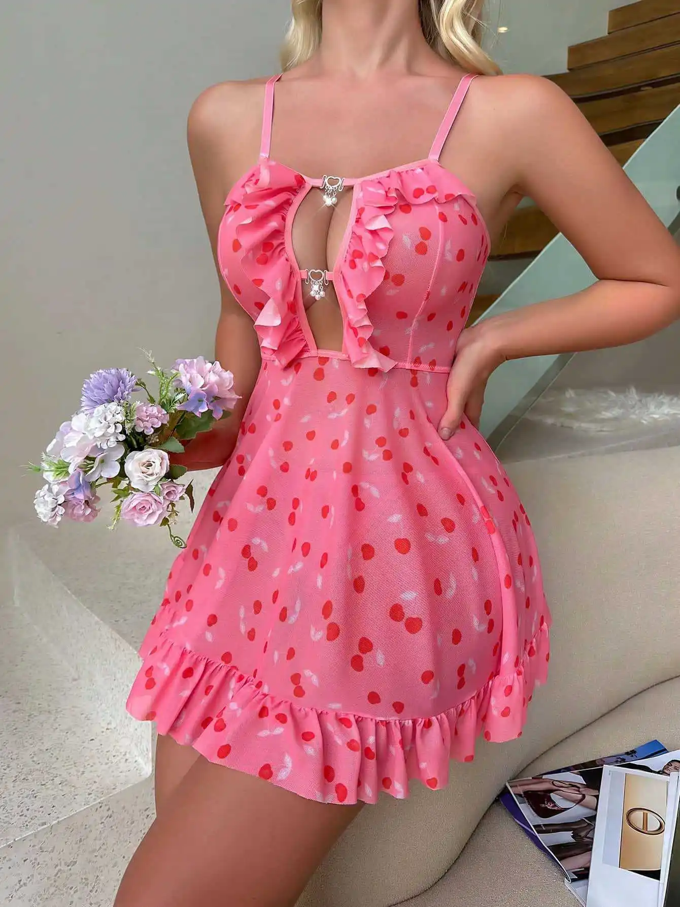 2026 European-American Style Valentine's Day Heart Print Spaghetti Strap Lace-Up Cute Pink Strapless Nightdress Set