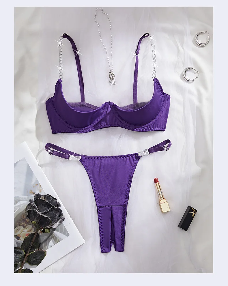 2026 New Arrival Exquisite Chain-Adorned Sexy Bra Set with Thong Crotch Tempting Lingerie for Women - Comfortable and Versatile